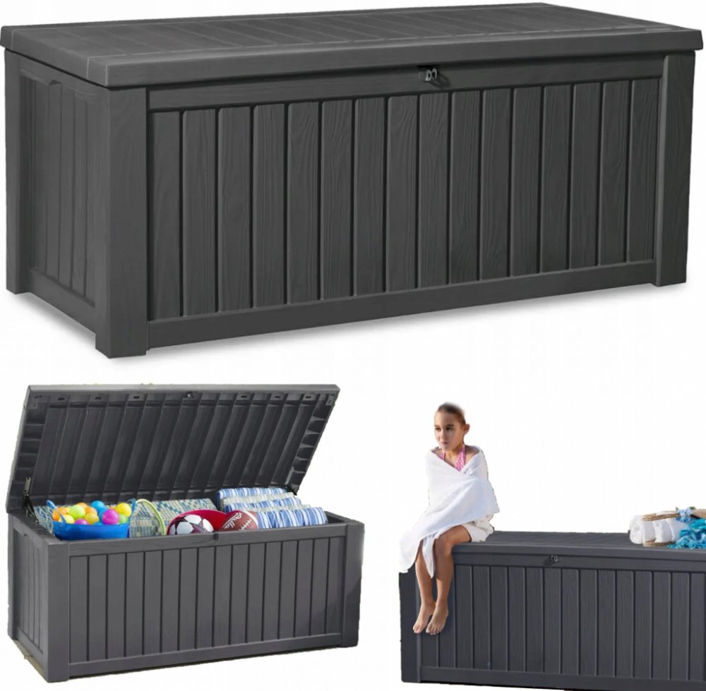 Složení skříně zvládnete během krátké chvíle bez použití jakéhokoliv nářadí. Zahradní box je vyrobený z vysoce kvalitní polypropylenové pryskyřice. Imituje dřevo a jeho strukturu, v kombinaci s grafitovou barvou představuje moderní design.