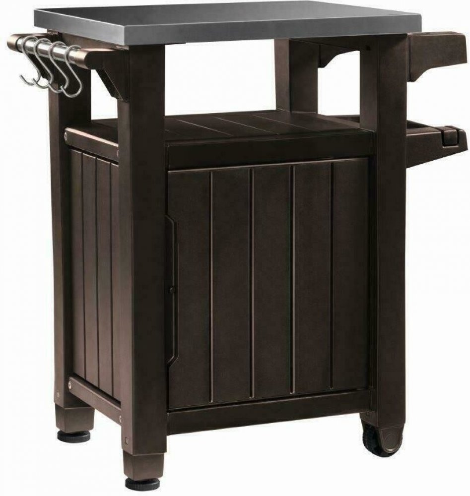 Mobilní skříňka, kterou oceníte především při grilování! Prostorná skříň s dvojitými dveřmi vybavená funkční nerezovou deskou a praktickou rukojetí s háčkem na ručníky, bude dobře fungovat při důležitých rodinných setkáních na terase nebo na zahradě.Technické údaje:výška výrobku: 90 cmšířka výrobku: 82 cmdélka výrobku: 52 cmhmotnost: 15 kgnosnost: 50 kgmateriál: plastbarva: hnědámožnost rozložení: nerozměr balení: 84 x 54 x 40 cmmateriál balení: PAP kartonObsah balení:1x mobilní skříňka UNITY - 105 L