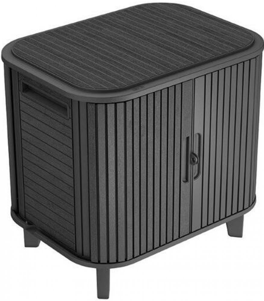 Grafitová barva s texturou imitace dřeva dodává stolku moderní vzhled, který se perfektně hodí k zahradnímu nábytku i zbytku zahrady. Kompaktní rozměry 62,4 × 59,3 × 47 cm umožňují umístění i na menších terasách nebo balkonech. Zvýšené nožičky (11,3 cm) zajišťují stabilitu a chrání obsah před vlhkostí ze země.