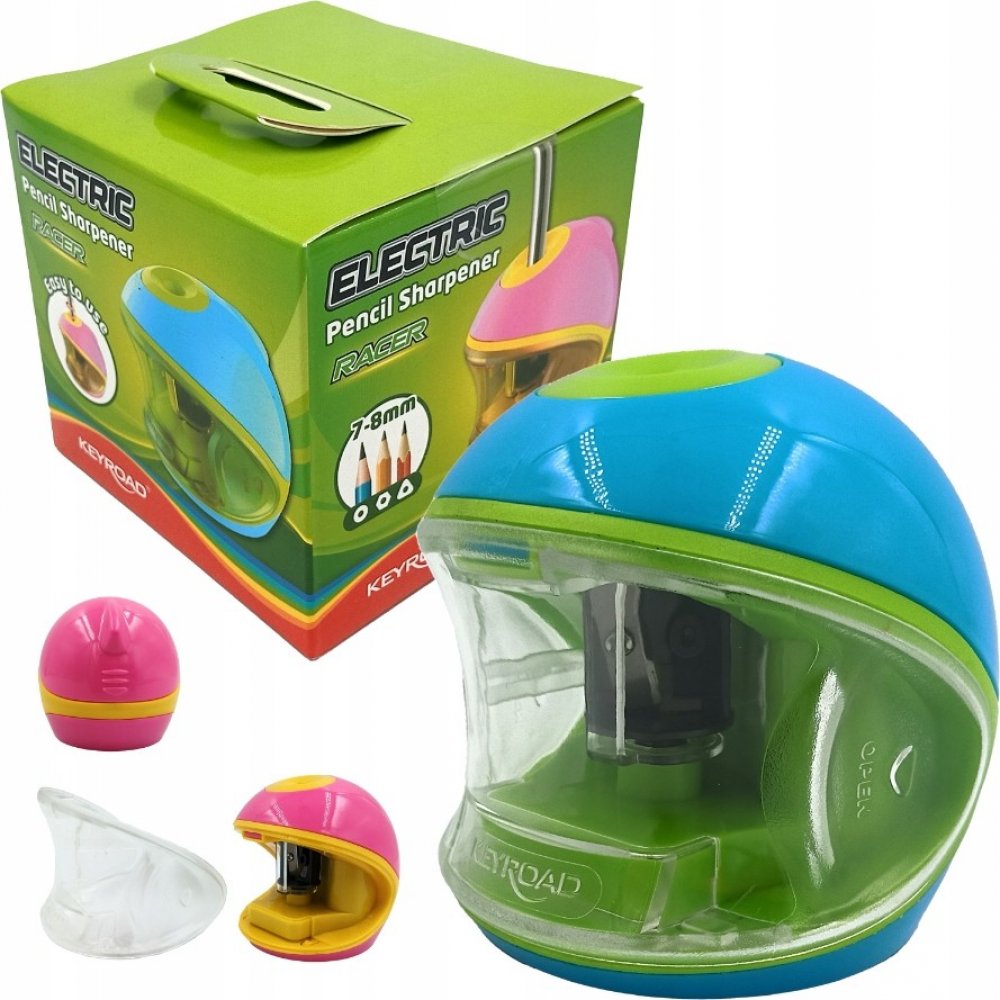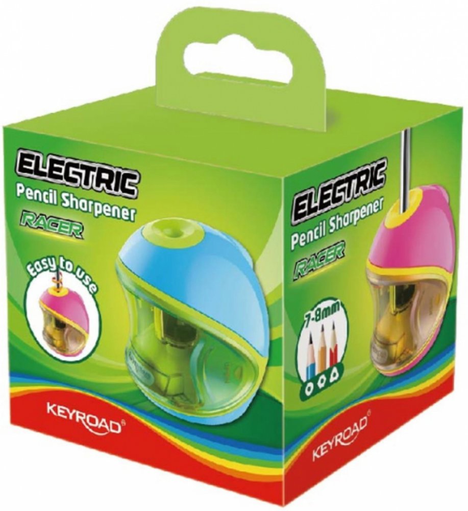 KEYROAD Ořezávátko KEYROAD, elektrické, mix barev 251.911. Stolní ořezávátko KEYROAD s velkokapacitním transparentním kontejnerem na baterie ve tvaru helmy pro rychlé a bezpečné ořezávání bez námahy. Dokonale ořezává kulaté, trojhranné i hexagonální tužky či pastelky o průměru 7-8 mm. Napájeno dvěma tužkovými bateriemi AA (kat. č. 301.020). Snadno vyměnitelná náhradní ořezávátka (nejsou součástí b...