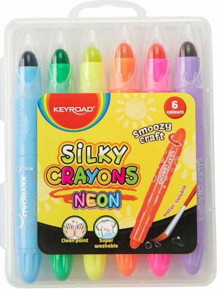 Každý pastel je uložen v plastové tyčince, která chrání před zašpiněním rukou. Protiskluzový úchop zajistí pohodlné používání. Vysoká barevná intenzita bez nutnosti silného tlačení, není potřeba strouhání. Pastely jsou rozmyvatelné a vypratelné. Na hladkém povrchu lze snadno smýt. Praktická plastová krabička zajišťuje snadné uskladnění. Balení obsahuje 6 kusů pastelů v neonových barvách.