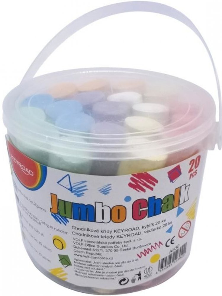 Chodníkové křídy JUMBO jsou díky svému silnějšímu tělu velmi snadno uchopitelné, průřez 24 x 22 mm, délka 105 mm, baleno v transparentním plastovém kbelíku s víčkem a praktickým uchem pro snadné přenesení, obsahuje 20 kusů kříd ve žluté, zelené, červené, modré a bílé barvě, pro kreslení na chodníky a jiné asfaltové, betonové plochy.