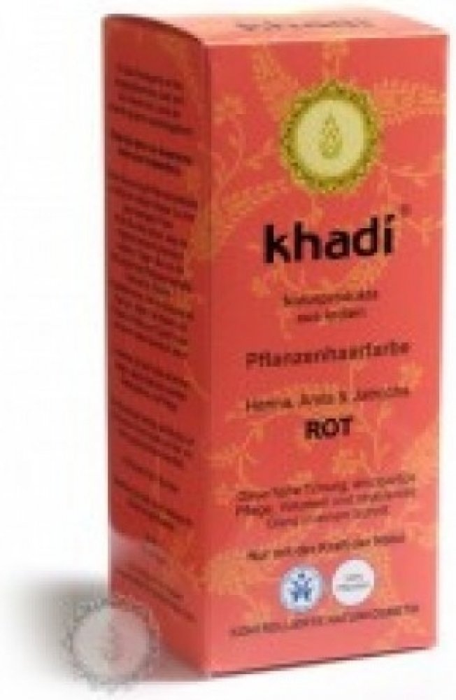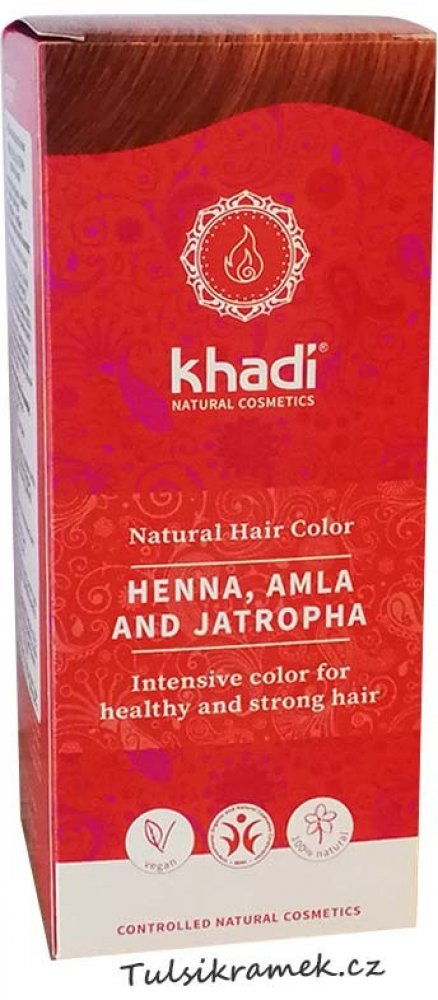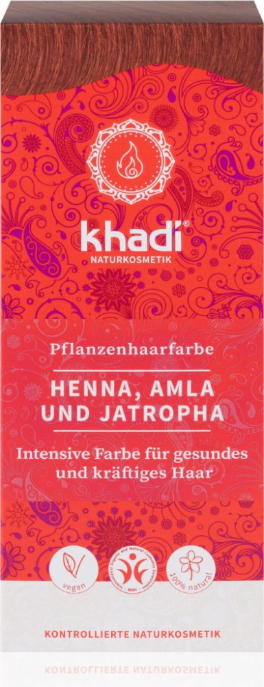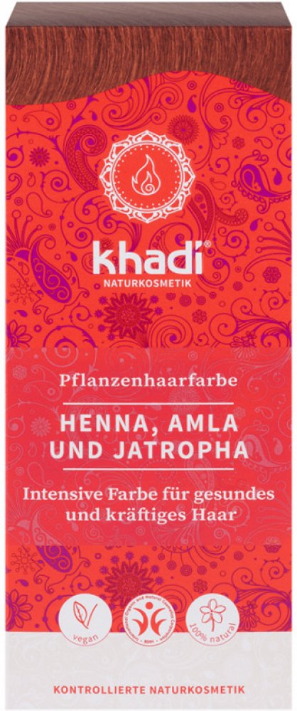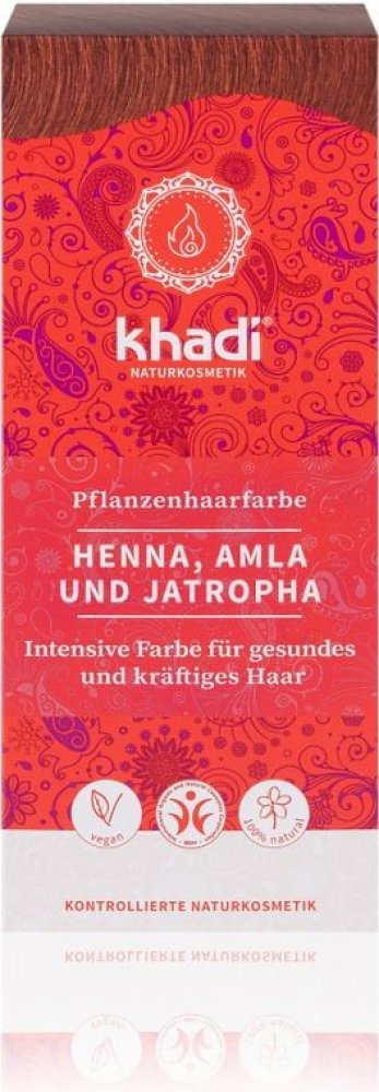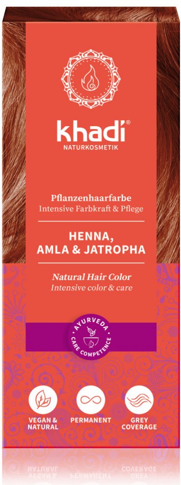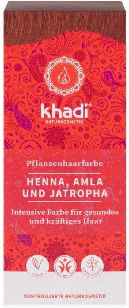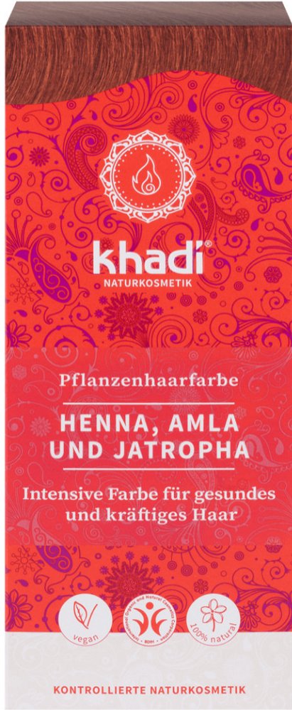 Khadi Henna & Amla & Jatropha je čistě přírodní barva na vlasy bez syntetických barvicích složek, zvýrazňovačů barev, kovových solí či konzervantů.