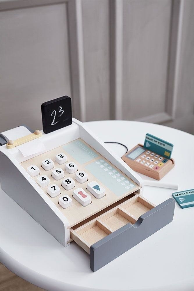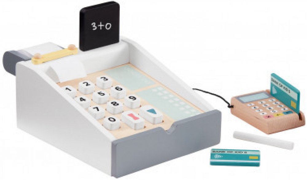 Pokladna v dřevěném provedení je nezbytným doplňkem dětského obchodu. Pokladna je vybavena mačkacími tlačítky s čísly, černou tabulkou s křídou pro psaní ceny, čtečkou platebních karet a zásuvkou na peníze.