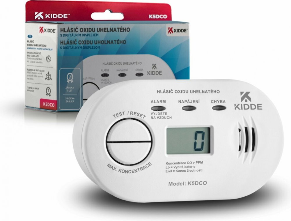 Ekonomické řešení a nízká pořizovací cena s elektrochemickým senzorem a 7-letou zárukou to je detektor oxidu uhelnatého (CO) Kidde K5DCO, který průběžně monitoruje přítomnost jedovatého oxidu uhelnatého v domácnostech nebo provozovnách, a tak poskytuje ochranu před jeho smrtelnými účinky. Kromě trojice kontrolních LED indikátorů disponuje také LCD displejem, na kterém průběžně zobrazuje naměřené hodnoty CO a další stavové informace. Hlásič lze pevně instalovat na stěnu nebo pro lepší pohodlí jednoduše volně položit na stůl, regál nebo jiný vodorovný povrch. Je ideálním bezpečnostním prvkem a spolehlivou ochranou před tímto tichým zabijákem nejen pro domácnosti, ale i v pronajatých ubytovacích prostorách nebo na dovolených.