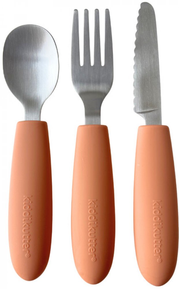 Dětský nerezový příbor Kiddikutter se skládá ze tří částí – vidličky, nože a lžičky – a je ideální pro děti, které si chtějí procvičovat samostatné jedení.