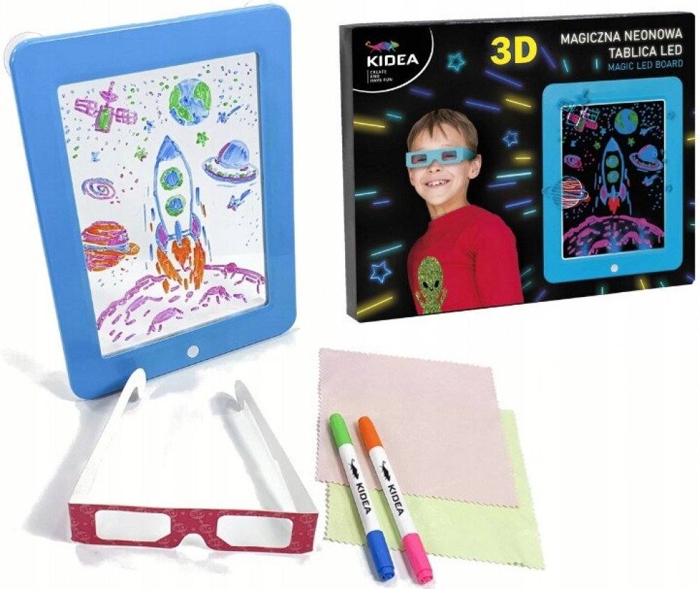 Psací a kreslící tablet 3D s podsvícením.. Kresli a piš, smaž a zase kresli - není třeba žádné tužky či papíru! 3D brýle pro 3D efekty. Dodatečné LED podsvícení s 8 světelnými efekty. Balení obsahuje psací tablet (18,5x24cm), 2 oboustranná barevná pera, 4 oboustranné archy s předkreslenými vzory a obrázky (celkem více než 40 ilustrací), čistící hadřík, 3D brýle. Přísavky na zadní straně tabletu pro lepší uchycení např. na stůl. Napájení na 3x 1,5V AAA baterie (nejsou součástí balení).