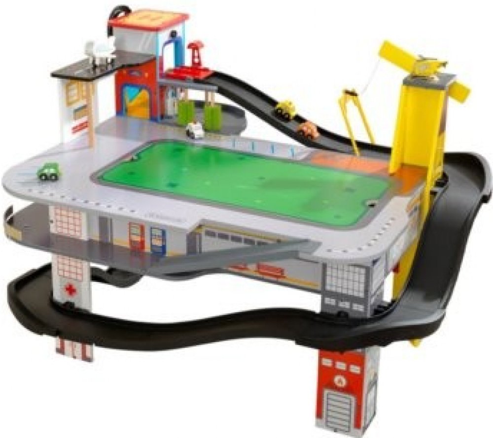 Dřevěný snadno sestavitelný hrací stůl s závodní dráhou, výtahem, praktickým úložným boxem a oboustranným víkem boxu. Víko uprostřed hracího stolu vytváří volnou plochu s imitací travnaté plochy pro hraní a po jeho otočení vznikne základna pro kostkové stavebnice. Pod víkem naleznou děti prostorný úložný box. Závodní dráha je obtočena kaskádovitě okolo stolu. Výtah se manuálně ovládá pomocí kola ve tvaru volantu. Dráhu doplňují dominantní prvky jako je skryté parkoviště, heliport, jeřáb a čerpací stanice s myčkou. Součástí balení jsou autíčka a vrtulník.