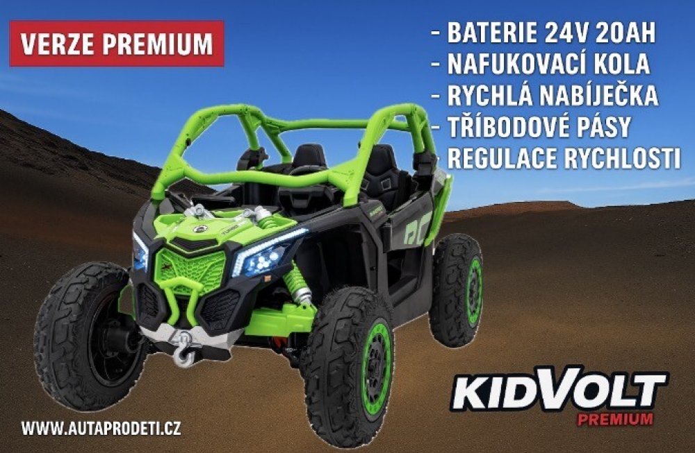 Verze PREMIUM pouze u nás Jsme jediný eshop v ČR který nabízí tuto nejprodávanější buggy ve verzi PREMIUM, což znamená baterie 20AH, nafukovací kola a regulaci rychlosti. KidVolt Premium