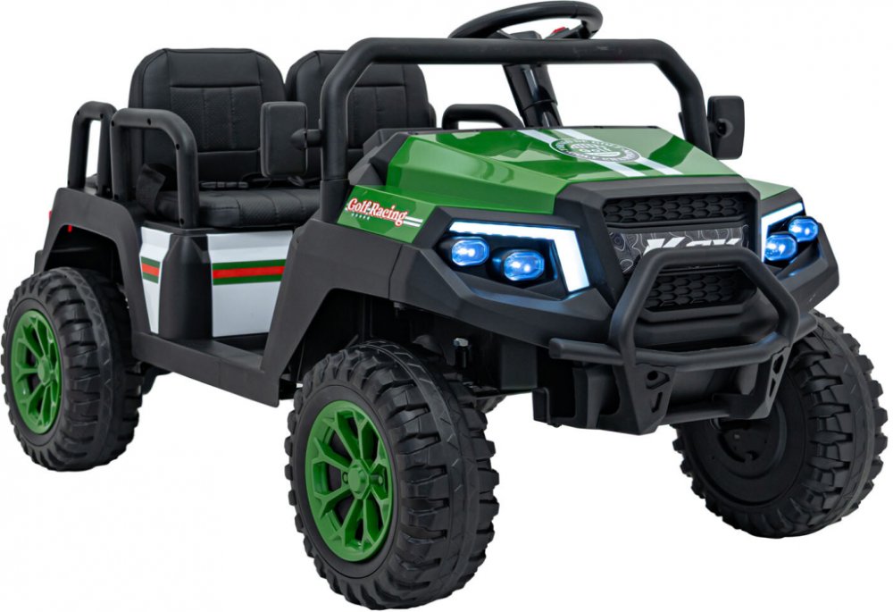 Robustní dětské elektrické buggy pro 4 osoby CHAMPION v zelené barvě nabízí výkonný 24V systém se 2×200 W motory, velká EVA kola 29×12 cm a odpružení vpředu i vzadu pro pohodlnou jízdu. O bezpečí se starají bezpečnostní pásy a dálkový ovladač 2,4 GHz s tlačítkem Stop, zatímco zábavu zajistí FM/MP3/Bluetooth/USB a LED světla.