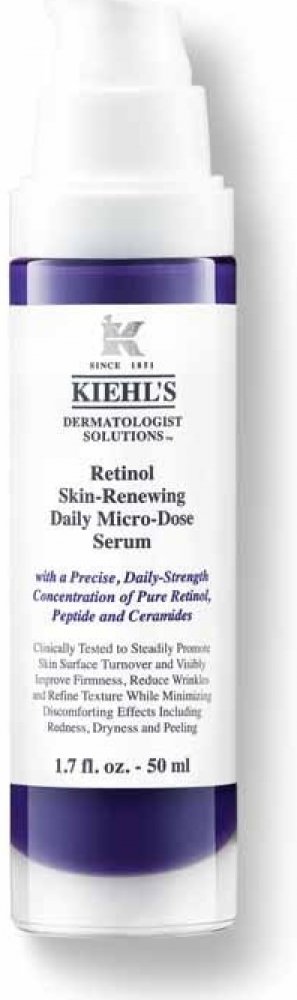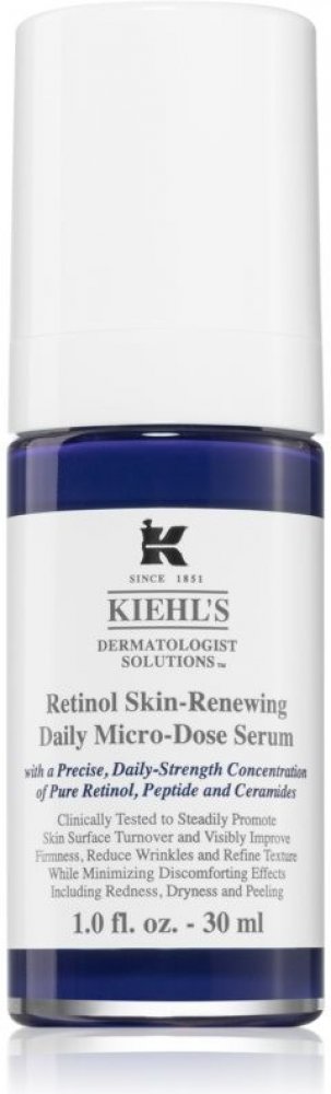 Objevte transformační sílu vysoce účinného séra proti stárnutí pleti Kiehl's Skin-Renewing Daily Micro-Dose Treatment s mimořádně šetrným složením s retinolem. Díky tomu je sérum vhodné pro všechny typy pleti. Patentované sérum revitalizuje pleť a viditelně redukuje známky stárnutí tím, že pleti dodává novou pevnost a mladistvější zářivost. Tajemství spočívá v mikrodávkované koncentraci retinolu, který urychluje buněčnou výměnu a stimuluje tvorbu kolagenu. Peptidy podporují regeneraci struktury pleti a zlepšují její schopnost absorbovat retinol. Ceramidy posilují kožní bariéru a zvyšují toleranci retinolu. Výsledek: 91 % uživatelů se shoduje, že tón a struktura pleti vypadají lépe*. Vzhledem k tomu, že používání retinolu zvyšuje citlivost pleti na slunce, je nezbytné používat během dne další ochranu před sluncem. Mikrodávkovaný retinol: Stimuluje obnovu buněk a tvorbu kolagenu pro pevnější a mladší vzhled pleti. -Peptidy posilující pokožku: Podporují regeneraci struktury pokožky a zlepšují její vnímavost k retinolu. -Ceramidová ochrana: Posiluje kožní bariéru a zvyšuje toleranci k retinolu. * Výsledky jsou založeny na 12týdenní spotřebitelské studii se 132 účastníky.