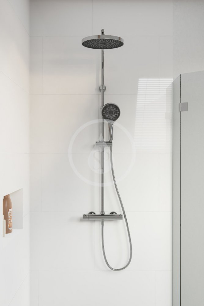Sprchový set obsahuje nástěnnou termostatickou baterii přepínač mezi hlavovou a ruční sprchou rozteč: 150 mm bezpečnostní zarážka při 38°C hlavovou sprchu průměr 260 mm 1 proud sprchovou hlavici průměr 130 mm 3 druhy proudů - jemný SilkFlow, intenzivní, kombinovaný EasyClick pohodlné přepínání druhů proudu tlačítkem Hlavová sprcha i sprchová hlavice jsou vybaveny funkcí snadného čištění trysek Tou...