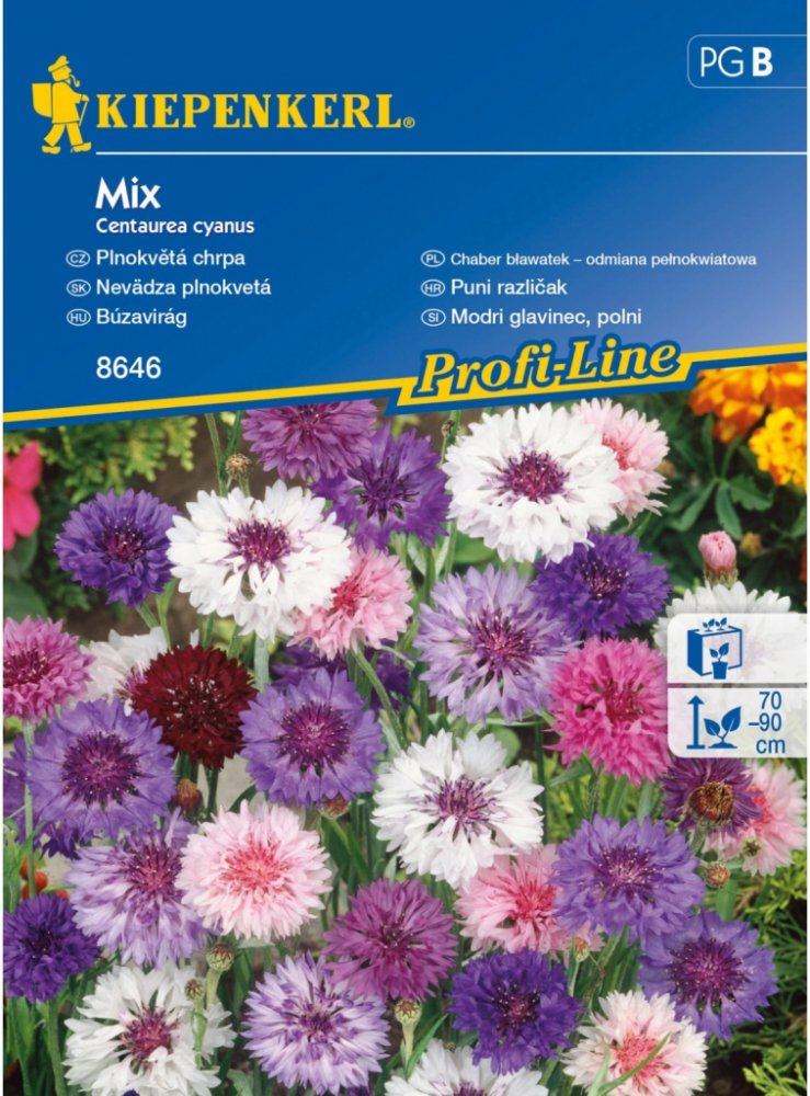 Kiepenkerl plnokvětá chrpa Mix je jednoletá, rychle rostoucí letní květina s plnými květy a úžasnou barevnou hrou. Do záhonů a k řezu. Rostlina může dosahovat délky 70 - 90 cm. Baleno s ochranou proti vyklíčení. Osivo není mořeno ani geneticky upravováno. - Obsah stačí na cca 50 rostlin - Výsev: Pěstování venku od dubna do června - Hloubka setí: méně než 0,5 cm - Klíčení: 8 - 14 dní při 12 - 20 °C - Pěstování: Vyjednotit pokud je výsev příliš hustý - Vzdálenost mezi rostlinami: 20 cm - Vzdálenost mezi řádky: 20 cm - Doba květu: VI - VIII