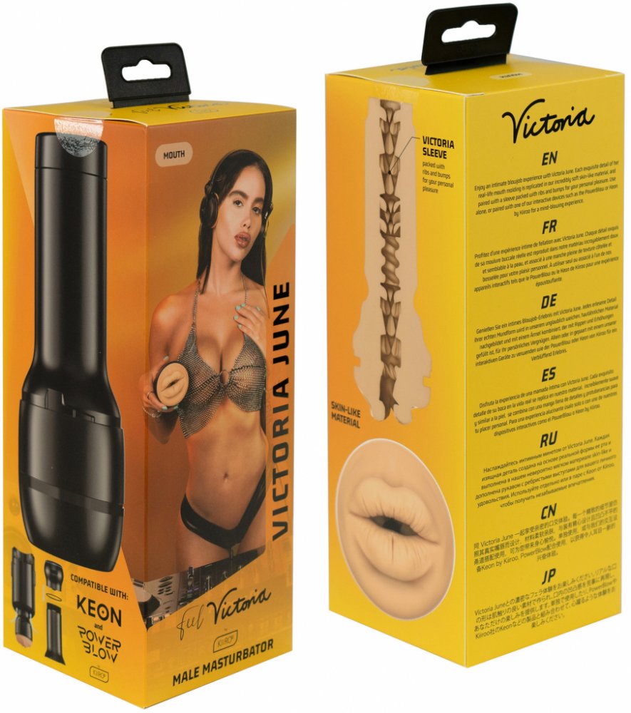 Masturbátor FeelVictoria June Mouth od Kiiroo s originální replikou úst umělkyně Victorie June. Masturbátor lze použít s PowerBlow a Keon adaptérem od Kiiroo pro plně automatické, interaktivní potěšení (není součástí, nutno dokoupit).