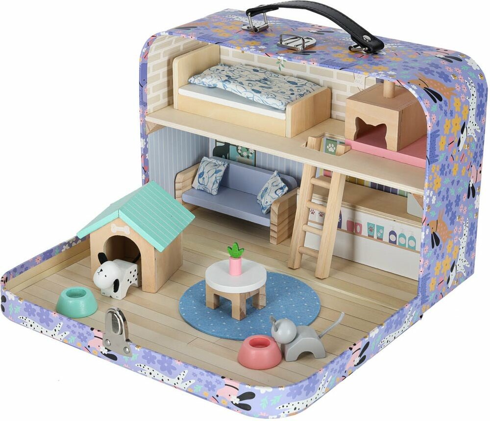 Kouzelný domeček v kufříku pro milovníky zvířátek přináší dvoupatrové mini bydlení plné detailů a doplňků. Snadno se přenáší díky praktickému uchu, po hře vše rychle uklidíte zpět do kufříku a pokoj zůstane bez nepořádku. Dřevěný nábytek, pejsek a kočička s vlastními miskami, budkou a škrabadlem podporují kreativní rolové hry doma i na cestách.