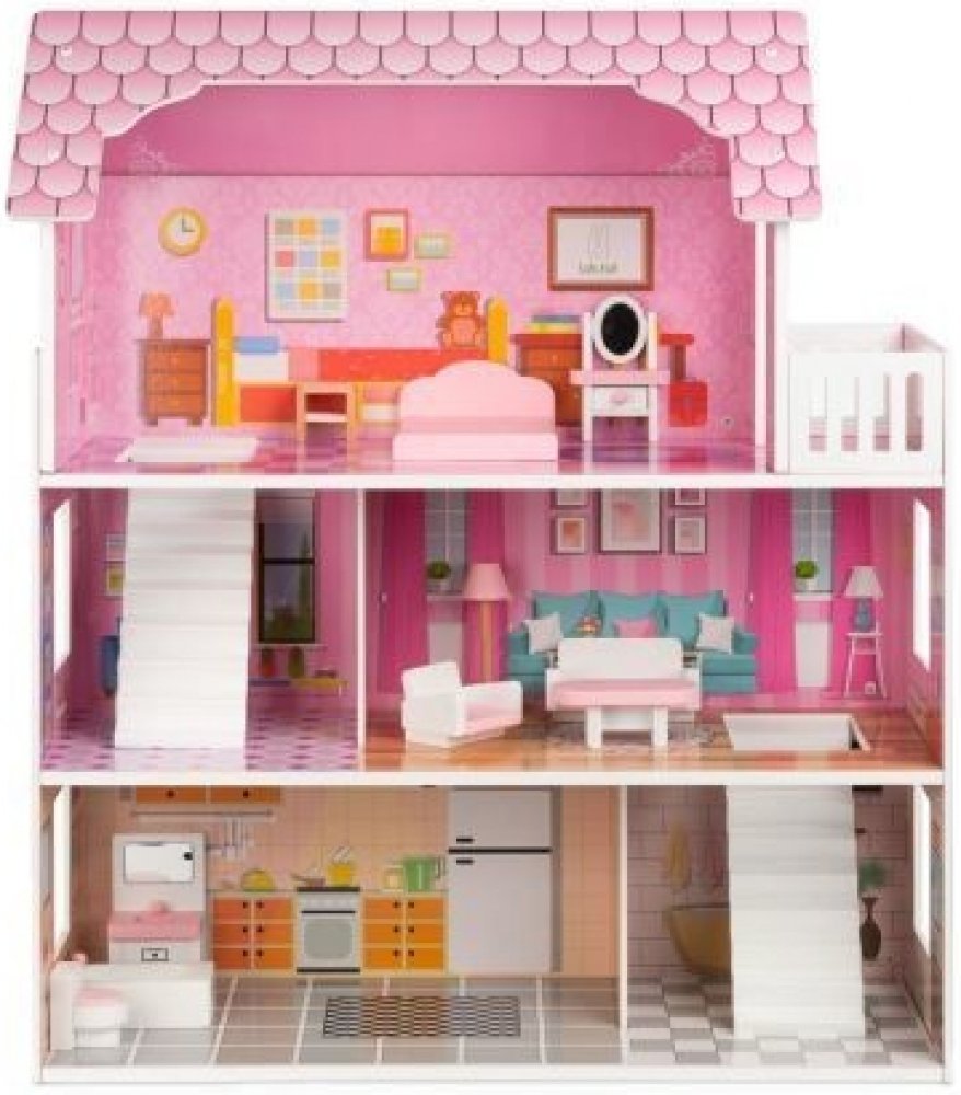 KIK Dřevěný domeček pro panenky Trikito 70 cm růžový + nábytek