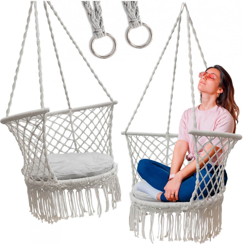 Relaxujte stylově díky naší designové zahradní houpačce s opěradlem, která nabízí komfort a bezpečnost s nosností až 150 kg.Šedé závěsné sedadlo s konstrukcí ve tvaru hnízda promění váš zahradní koutek v klidné místo k odpočinku. Díky polštáři, který je součástí balení, si můžete pohodlně opřít záda o kovový kruh. Houpačka je stabilní a umožňuje sedět jak přímo, tak pohodlně v tureckém sedu. Vlastnosti a výhody: Designový prvek – Specifický design dodá vaší zahradě neobyčejnou atmosféru. Pohodlná relaxační zóna – Konstrukce typu hnízdo umožňuje pohodlné sezení. Odolnost a bezpečnost – Maximální zatížení až 150 kg zajišťuje bezpečné používání pro každého. Obsah balení: Hnízdo houpačka Polštář o rozměrech 60 cm x 50 cm Klasická šedá barva v kombinaci s boho designem se skvěle hodí jak do moderních, tak rustikálních prostředí.Specifikace Materiál:polyester a bavlna (pratelná síťovina + provazy); pozinkované roury (kovová konstrukce + základna) Barva:šedá Nosnost:do 150 kg Průměr základny:60 cm Tloušťka základny:3 cm Průměr opěradla:80 cm Tloušťka opěradla:2 cm Výška síťky (při měření na plocho):45 cm Délka provazů:80 cm Průměr montážních kroužků:6 cm Rozměry balení:83 cm x 83 cm x 9,5 cm