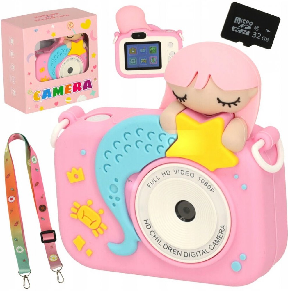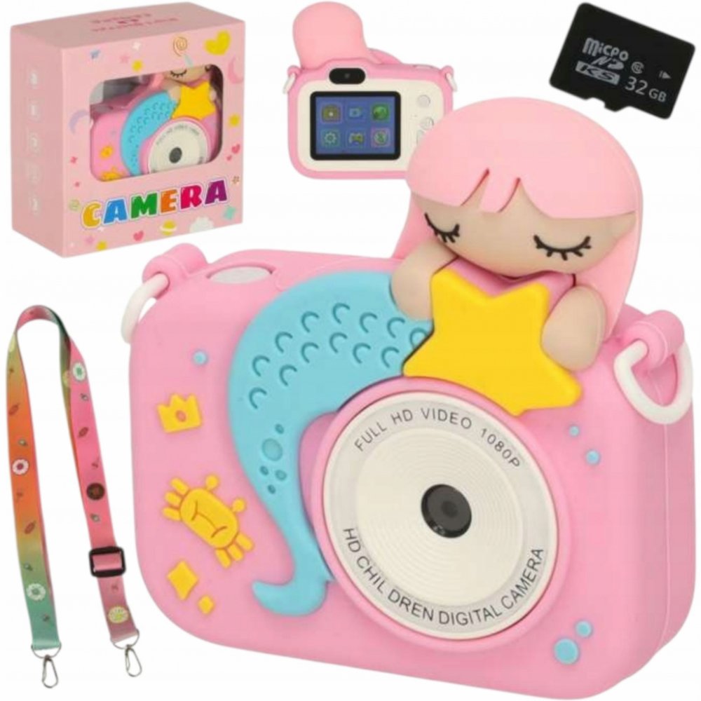 Dětský digitální fotoaparát s motivem mořské panny a s pamětí 1GB. Nabízí nejen zachycení snímků, nahrávání videí, ale také zábavné hry. Intuitivní tlačítka umožňují snadné přepínání mezi režimy. Kamera má 2palcový barevný TFT displej, který umožňuje pořizovat fotografie a nahrávat videa v kvalitě až 1440x1080.