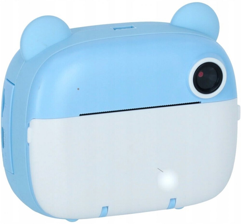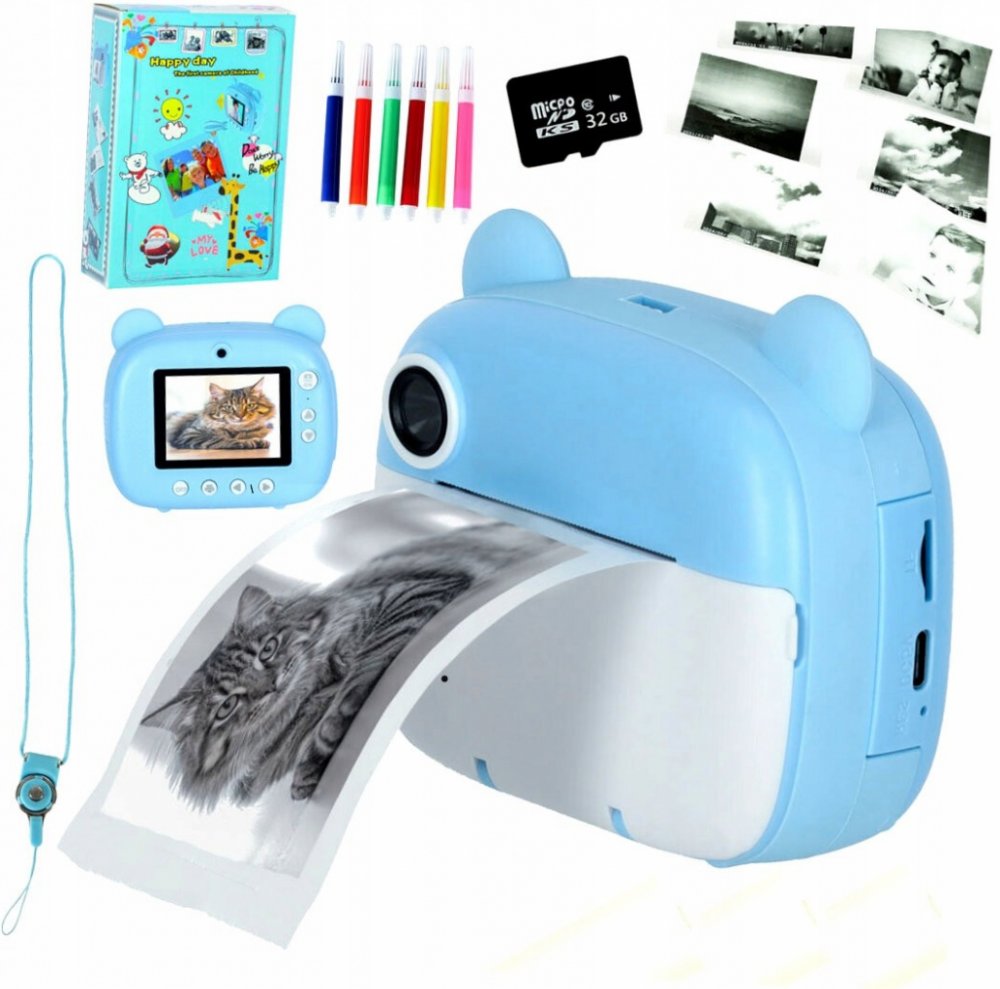 Modrý okamžitý fotoaparát je hračka, která podporuje kreativní hru. Umožňuje pořizovat fotografie (2 objektivy - přední a zadní), nahrávat videa v rozlišení 1080p, přehrávat hudbu a hrát hry. Fotoaparát tiskne černobílé fotografie, které si děti mohou vybarvit pomocí šesti přiložených fixů. Součástí sady jsou tři role papíru do tiskárny, paměťová karta s kapacitou 32 GB, modrá šňůrka a USB kabel pro nabíjení zařízení. Přístroj podporuje rozvoj drobné motoriky a podněcuje kreativní myšlení dětí.