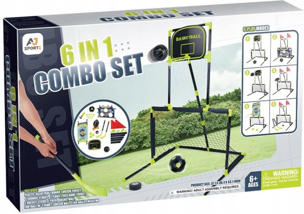 Sada obsahuje i potřebné příslušenství: síť na branku, tři nafukovací míče, dvě hokejky na pozemní hokej, puk a plastové míčky.