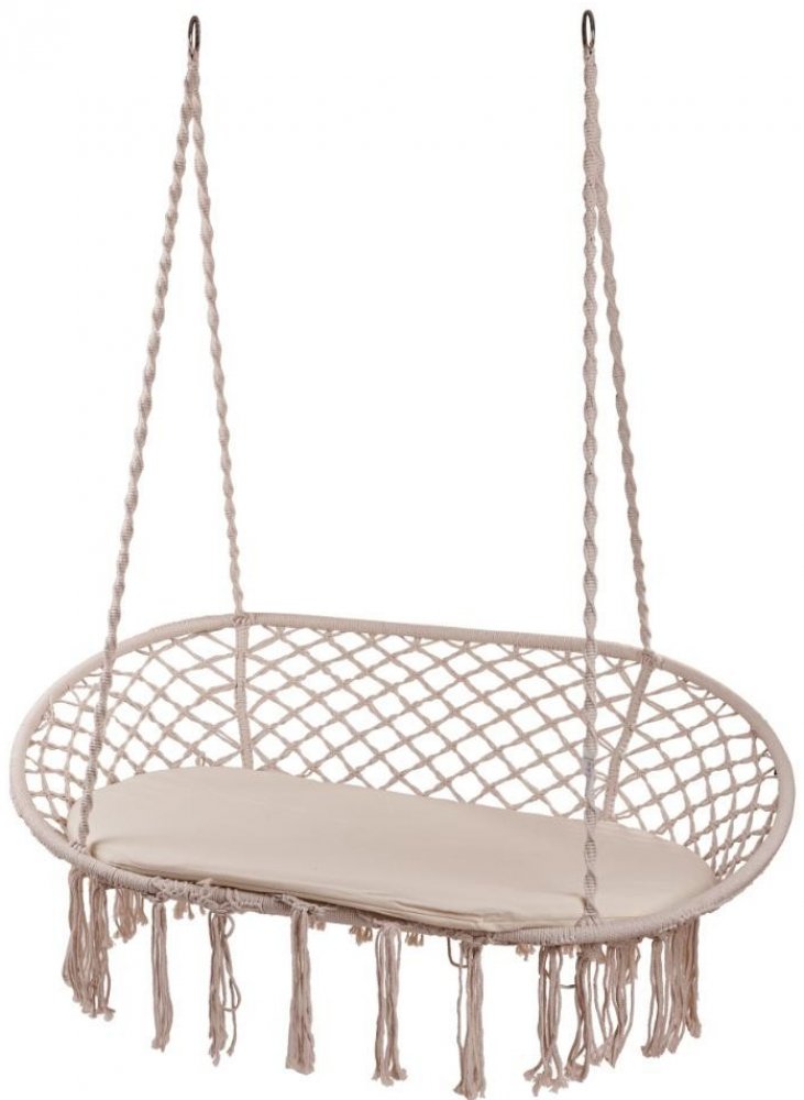 Boho styl - béžová barva a elegantní střapce kolem základny dělají z houpačky krásnou dekoraci každé zahrady.