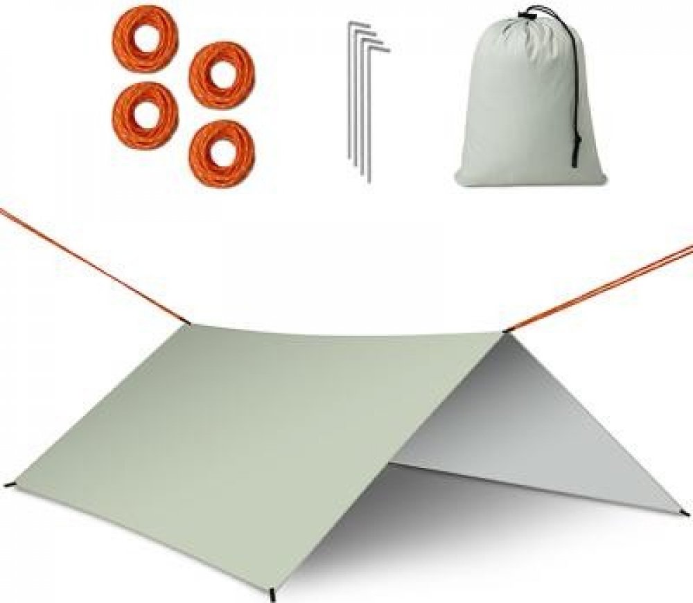 Složená plachta nezabírá mnoho místa a váží velmi málo, takže ji můžete snadno sbalit do batohu na další cestu. Napínací lana a upevňovací kolíky jsou součástí balení.