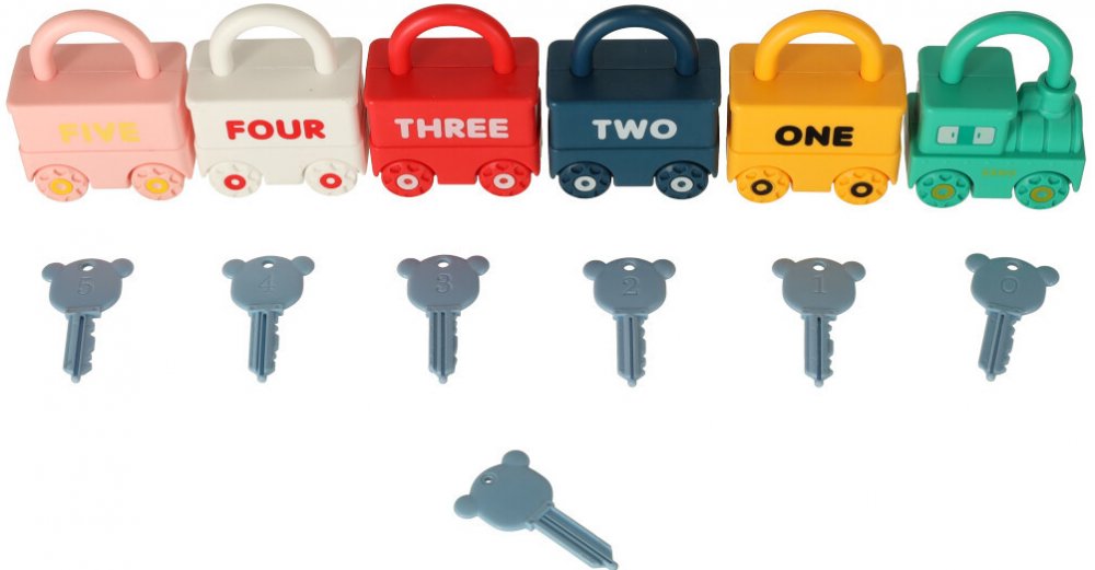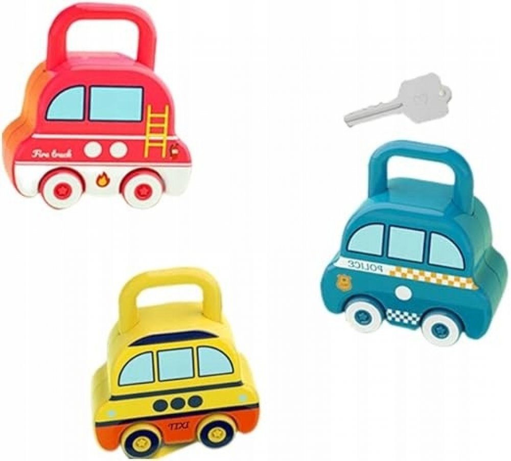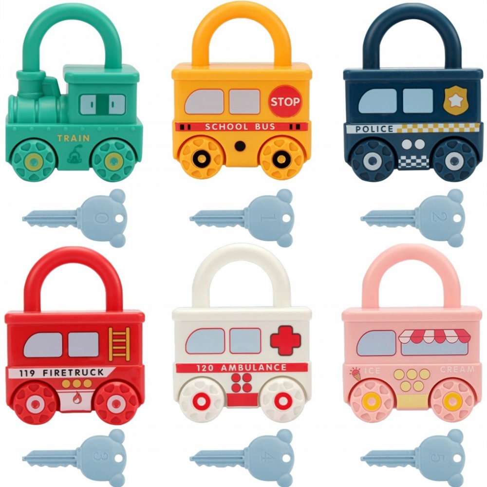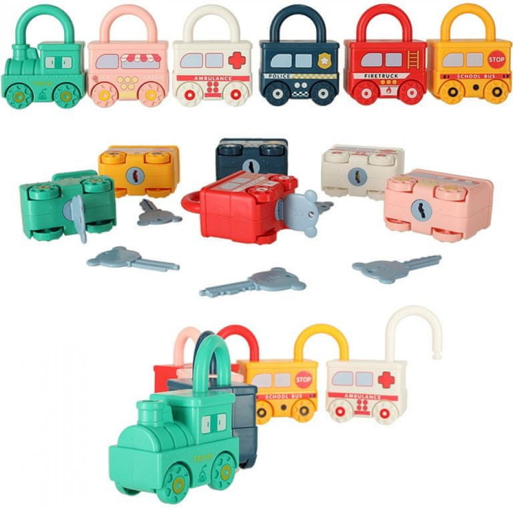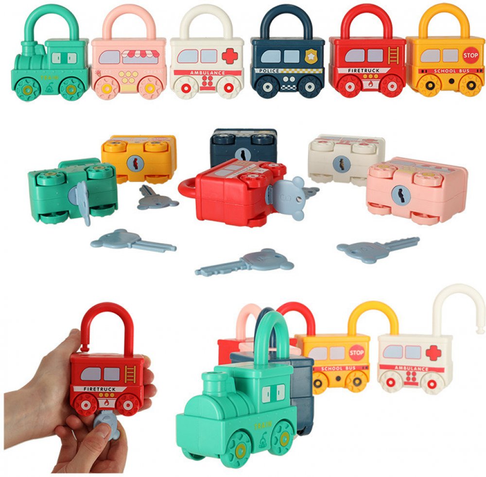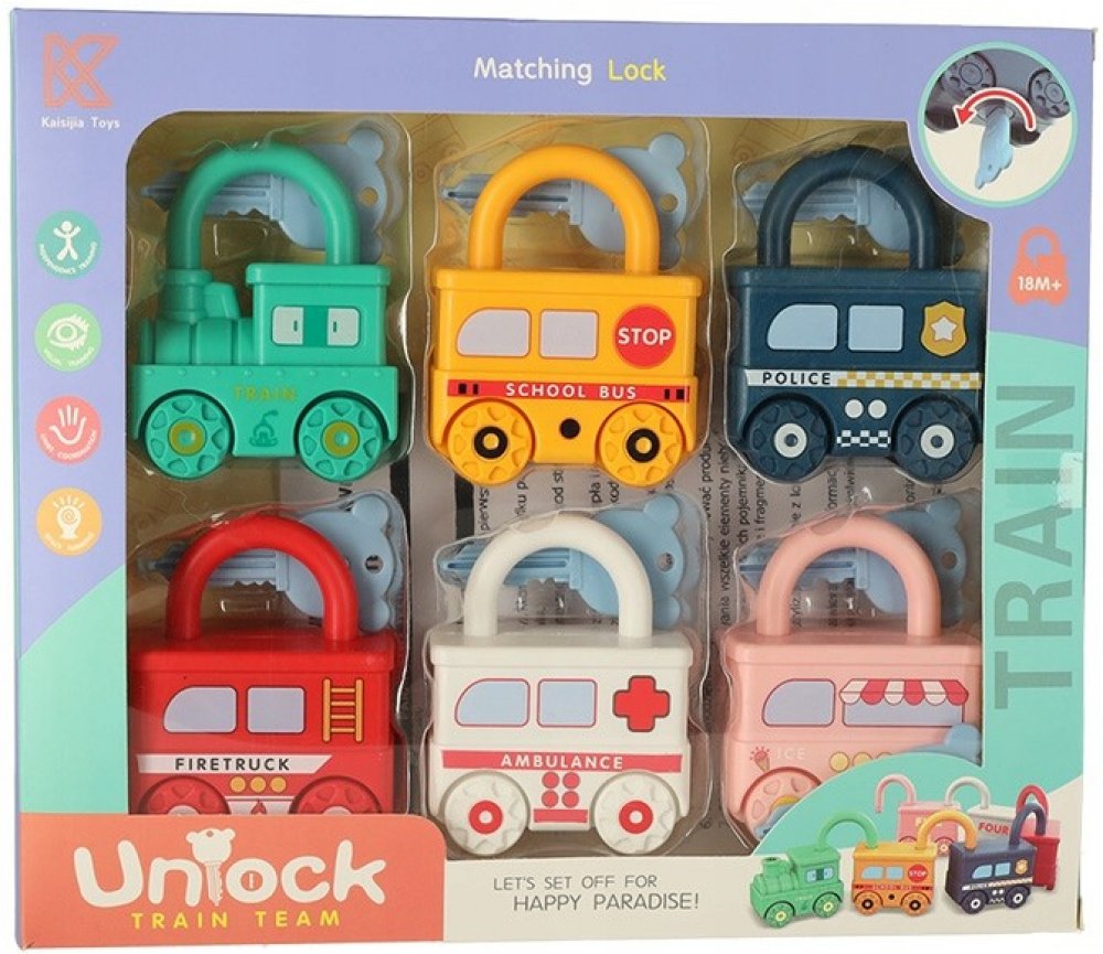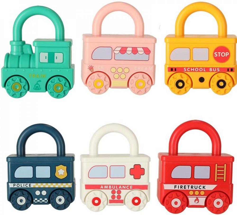 Sada obsahuje šest roztomilých autíček se zámky: lokomotivu, školní autobus, policejní vůz, hasičský vůz, sanitku a zmrzlinářský vůz. Každé autíčko má jinou barvu a učí děti rozpoznávat základní barvy. Z jedné strany má ilustraci, z druhé název v angličtině. Dítě může pomocí čísel na kolečkách a klíčích správně přiřazovat klíčky k zámkům, nebo to zkoušet metodou pokus-omyl. Speciální klíček odemkne všechny zámky, což umožňuje nekonečné kombinace. Po otevření lze autíčka propojit a vytvořit barevný vlak. Hra podporuje jemnou motoriku a koordinaci.