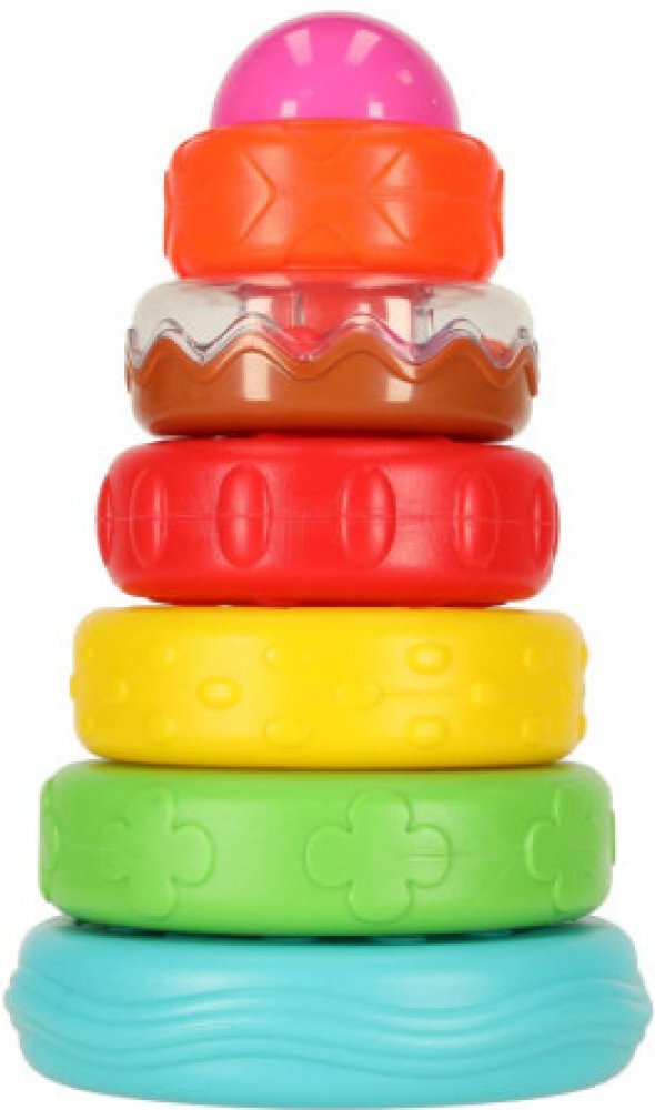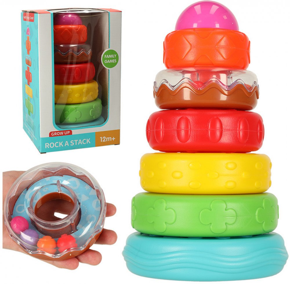 Sedm velkých bloků lze skládat na sebe a vytvořit tak působivou pyramidu! Každý dílek má jinou barvu a jinou strukturu. Jeden z bloků má navíc v sobě kuličky, které můžete vidět skrz průhlednou horní část.