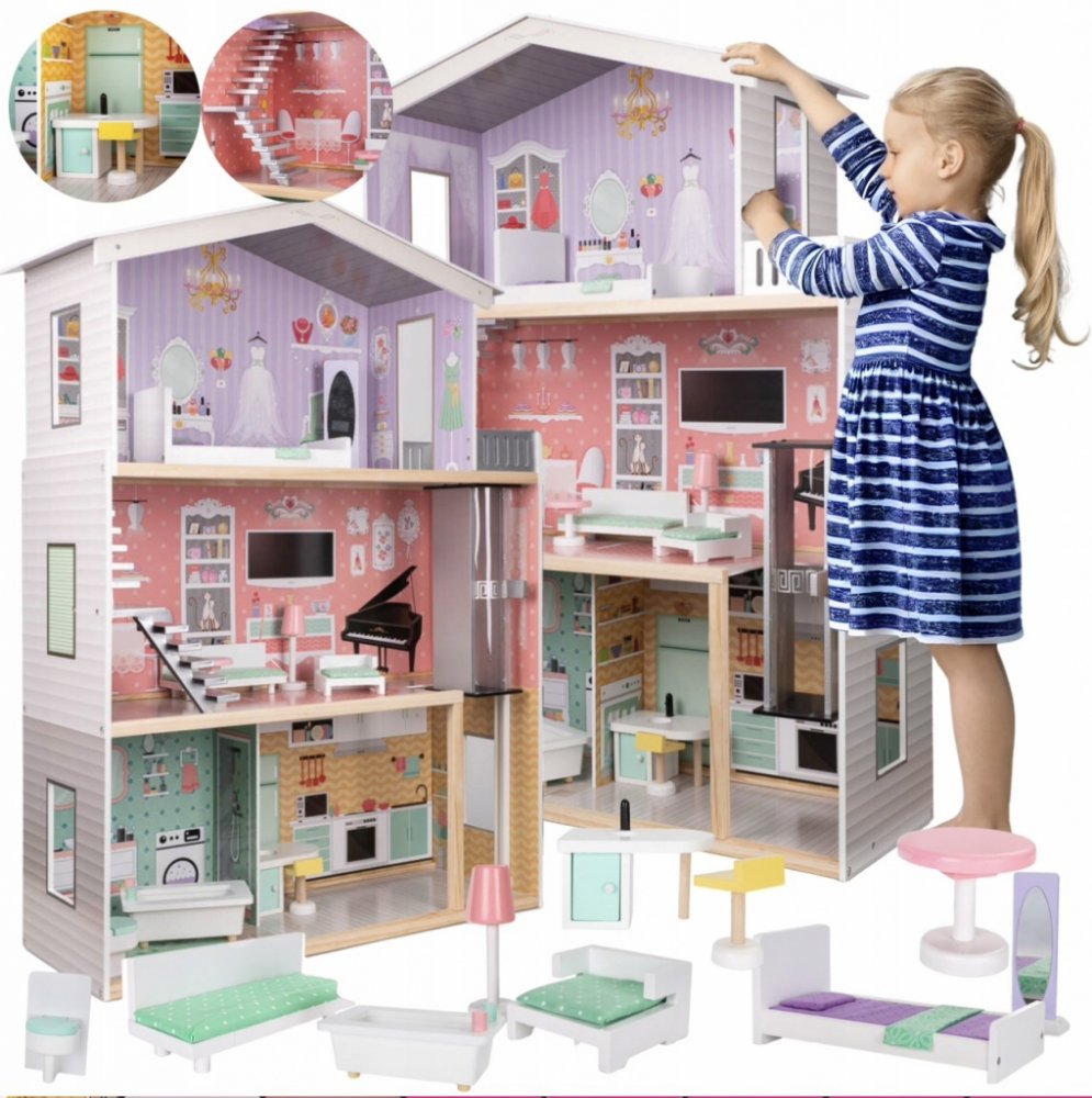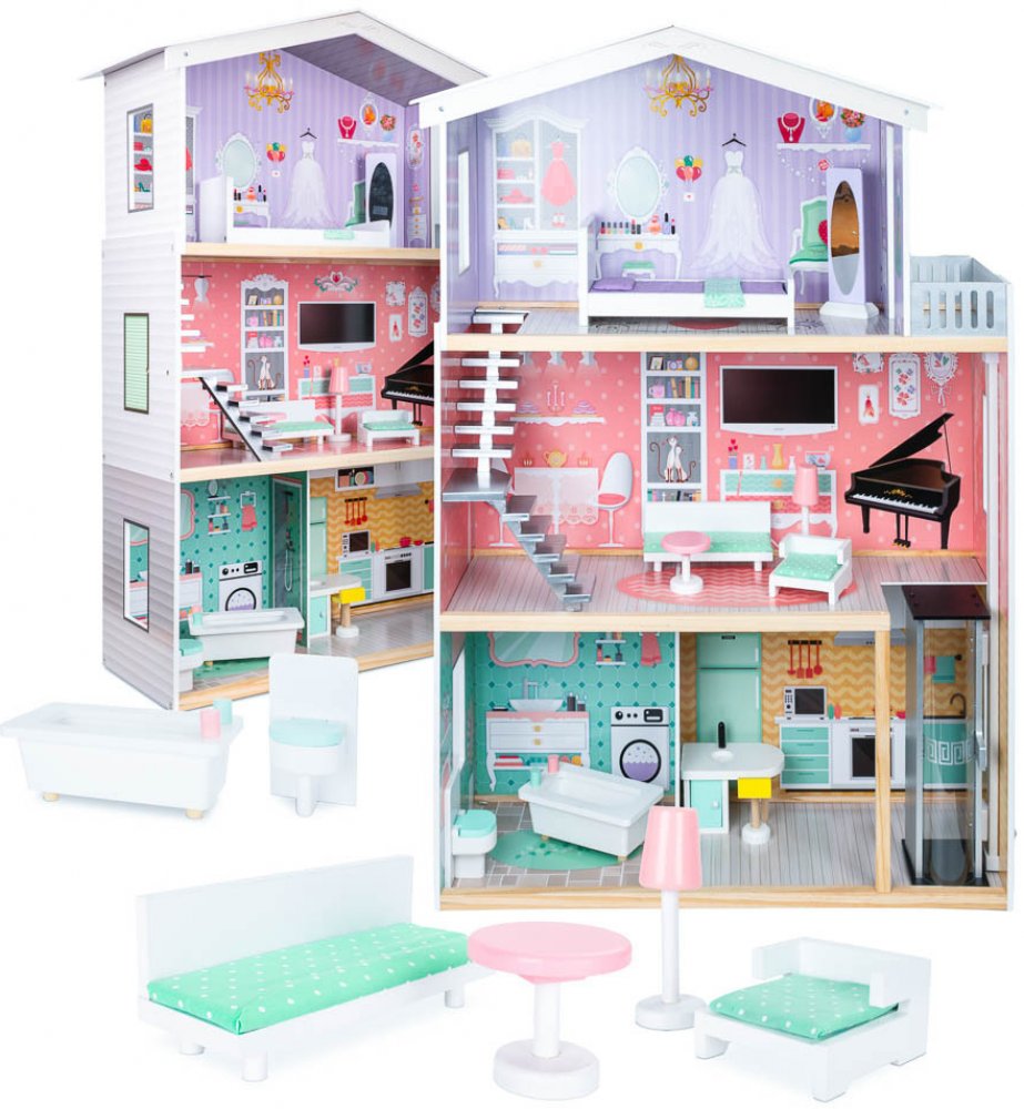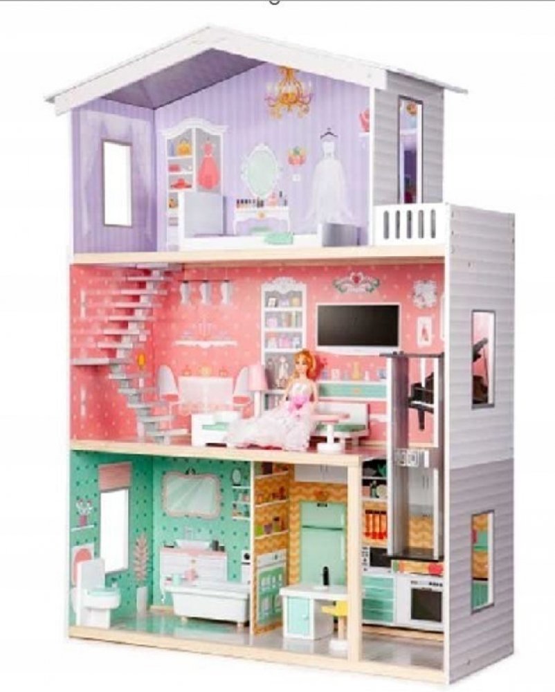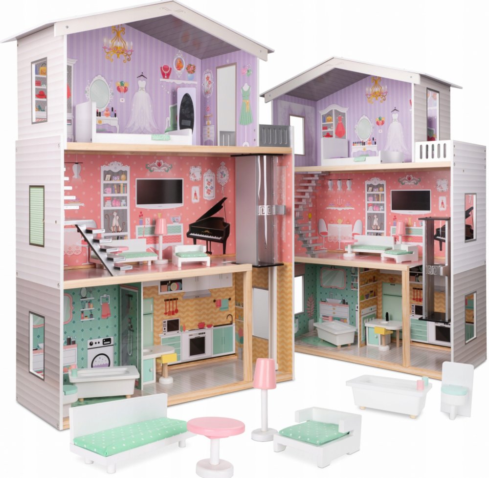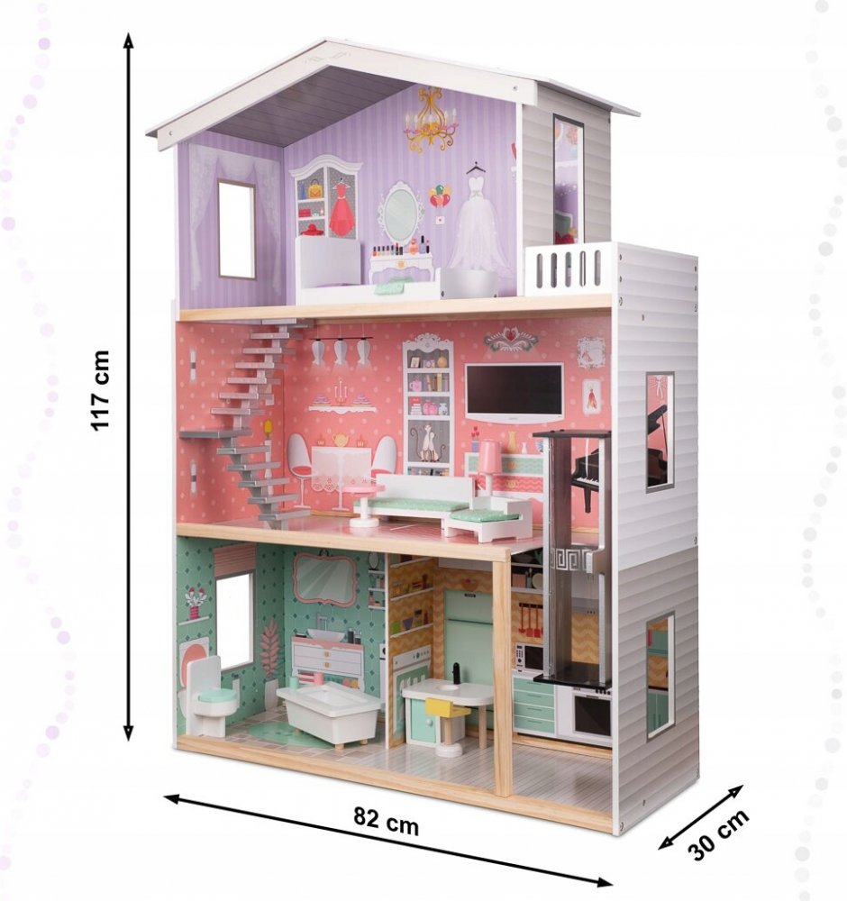 Domeček pro panenky v pastelových barvách, dřevěná vila + nábytek s výškou 117 cm. Jedinečný pastelový domeček pro panenky bude splněným dětským snem. Pojme všechny oblíbené panenky, maskoty a figurky vašeho dítěte. Obrovská dvoupatrová rezidence byla vybavena 4 samostatnými pokoji, balkonem a výtahem. V domečku najdete kuchyň, koupelnu, salon, ložnici. Domeček je plně vybaven. Sada obsahuje krásný dřevěný nábytek, který bude dokonalým doplňkem každé místnosti v domě. Mezi nábytkem najdete postel, lampu. zrcadlo, křeslo, pohovku, vanu, WC, stůl, kuchyňskou skříňku, židle. Velké množství prvků dává možnost nekonečné zábavy. Kreativní hračka, se kterou není čas se nudit. Kvalita a preciznost zpracování zaujme svými detaily. Miniatury nábytku a krásná grafika na stěnách činí dům jedinečným a velmi útulným. Všechny prvky domečku byly pečlivě vybroušeny tak, aby si dítě při hře nezadřelo třísku do rukou. Domeček zaručí nejen skvělou zábavu, ale bude i skvělou dekorací do dětského pokoje. Dokonale podněcuje fantazii, povzbuzuje kreativní a nekonvenční myšlení a u nejmenších také velmi rozvíjí manuální zručnost. Společná stavba domu naučí dítě spolupracovat a podpoří rozvoj sociálních kompetencí.
