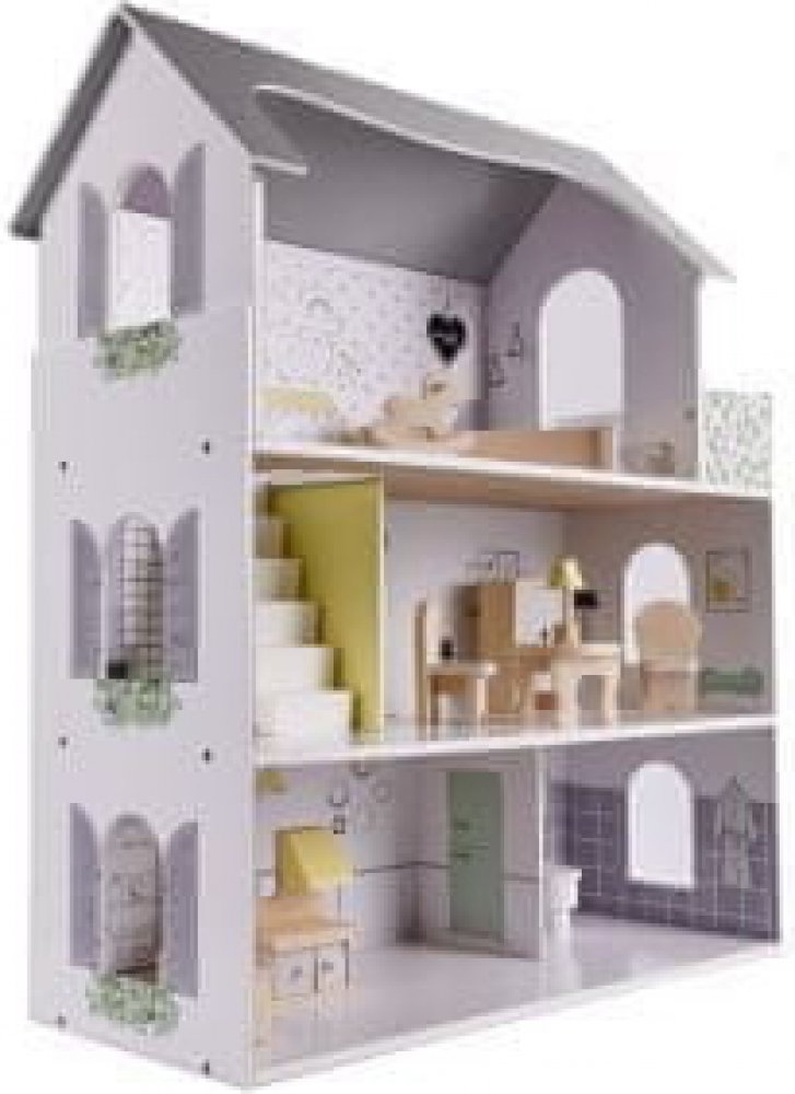 KIK KX6278 Dřevěný domeček pro panenky + nábytek 70cm šedý