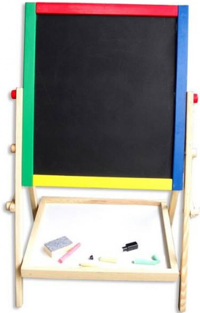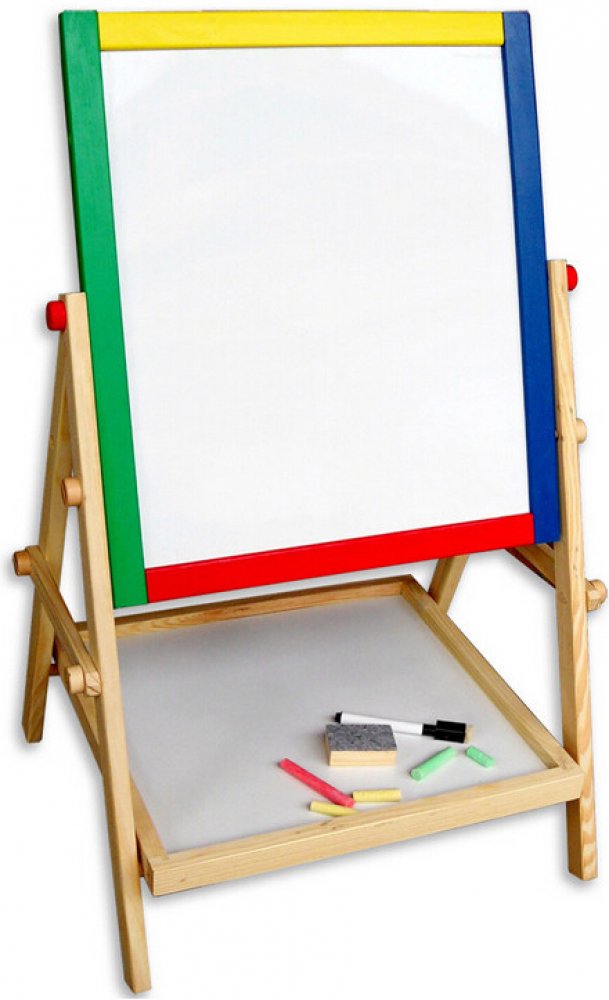 Tabule na barevném dřevěném rámu s policí. Na jedné straně černá a na druhé bílá. Obsahuje křídu, houbičku a suchý stírací fix. Kreslící plocha: 35x40 cm.