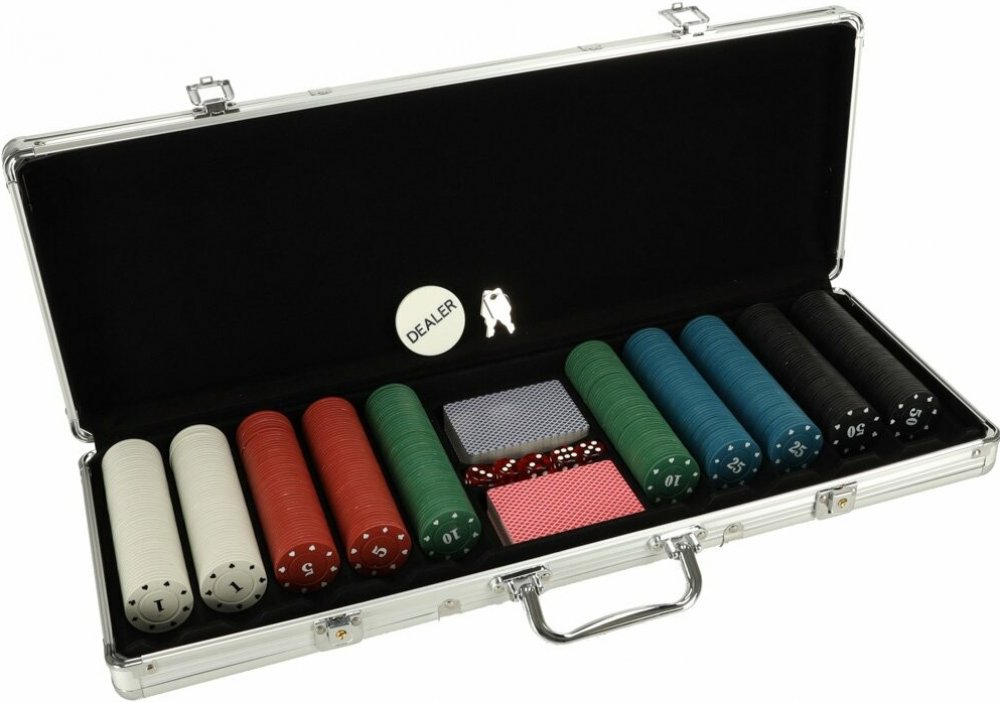 Specifikace: Typ produktu: pokerová sada v kufříkuMateriál kufříku: hliník + pěnová výstelkaMateriál žetonů: plast s kovovým jádrem (solid feel)Počet žetonů: 500 ks (různé hodnoty)Hmotnost žetonu: cca 11,5 gBarva žetonů: mix (bílá, červená, modrá, zelená, černá)Doporučený počet hráčů: 2–10Součást balení:Žetony x500Balíčky karet x2Kostky x5Klíč x2Kufr