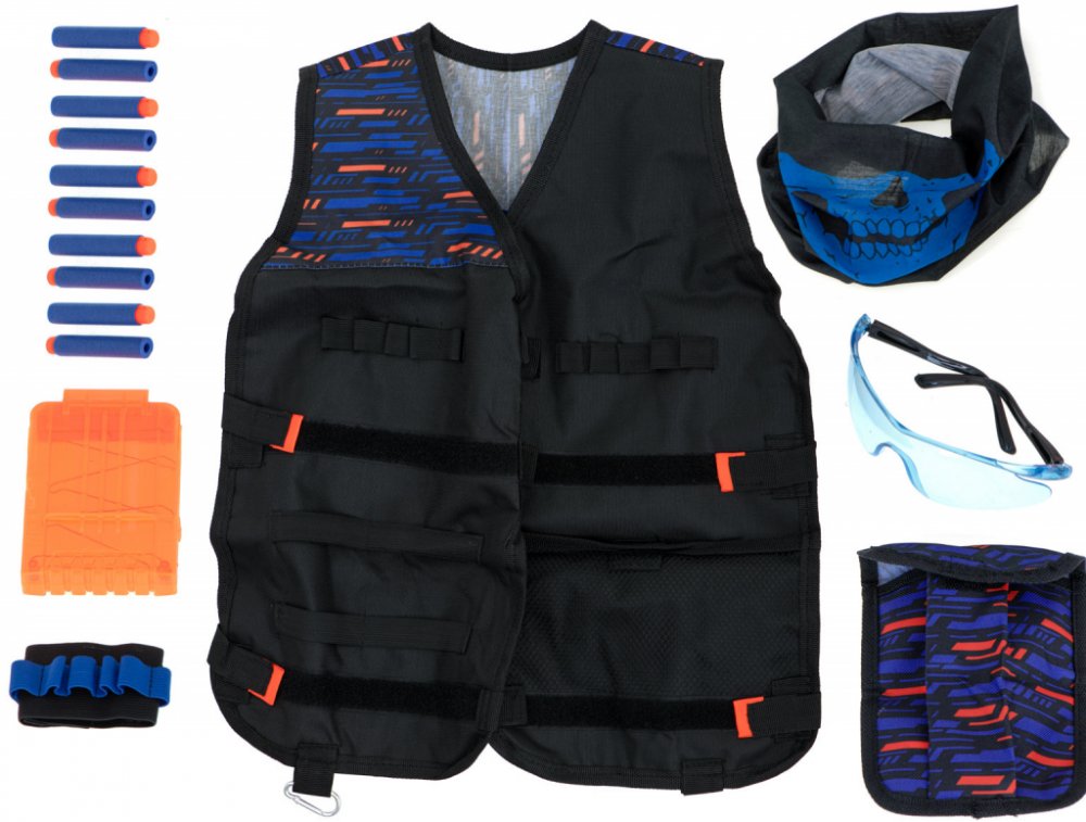 Sada taktické vesty a potřebného příslušenství k hračce s pěnovými náboji a pistolí. Vesta je nezbytným doplňkem pro ukládání nábojů. Vesta je lehká a velmi pohodlná. Nebude vám bránit v pohybu během bitvy. Na zadní straně vesty je celoplošný síťovaný materiál, který zabraňuje pocení během hry.