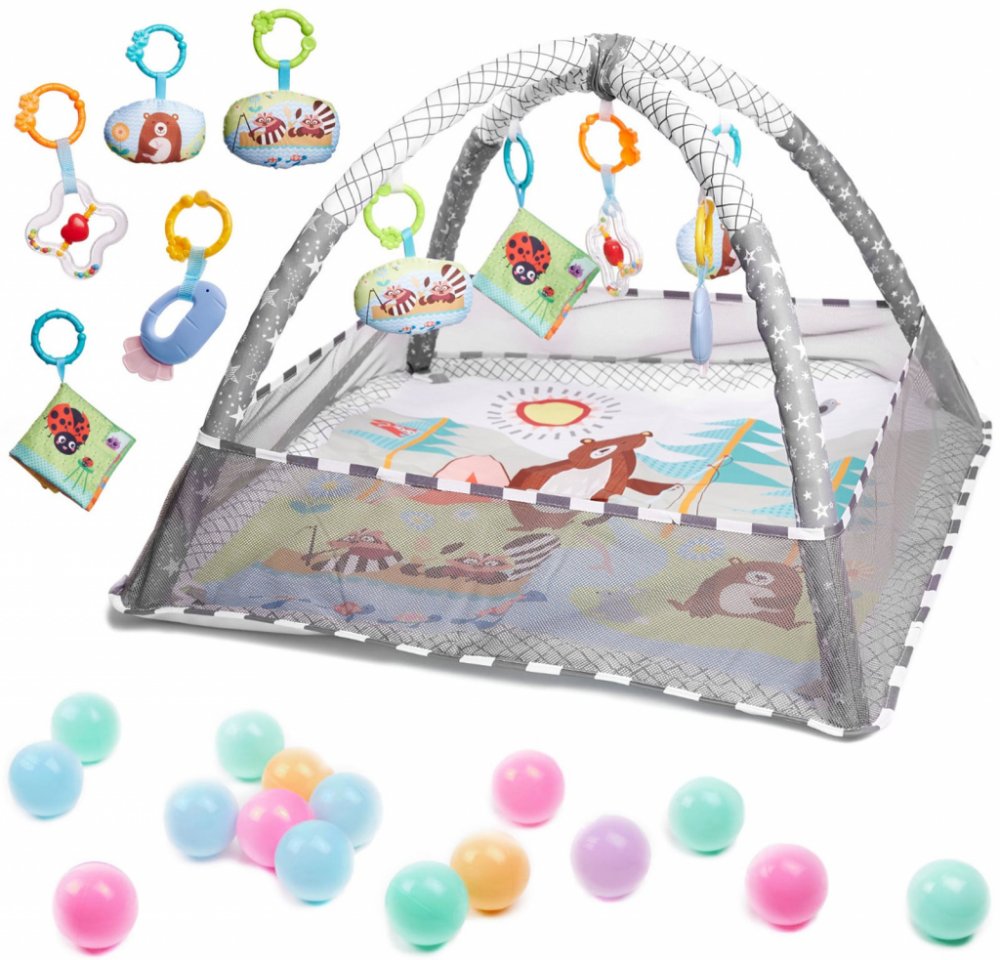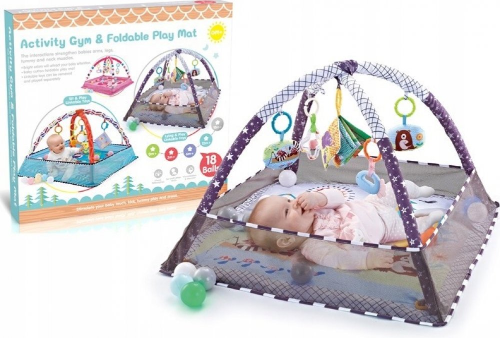 Podložka s hračkami zavěšenými na stoupačkách- Barevné hračky zavěšené na obloucích přitahují pozornost dítěte a motivují ho ke cvičení a posilování svalů krku, rukou a nohou. Kromě toho je skvělá pro první pokusy o samostatné sezení.