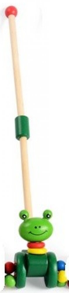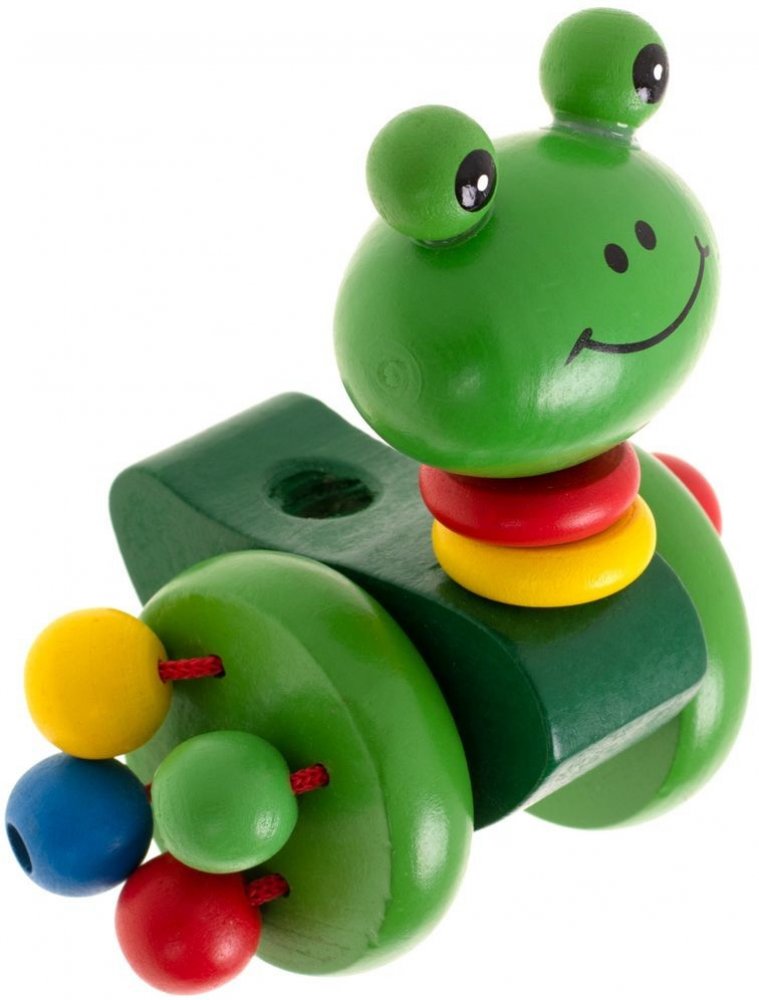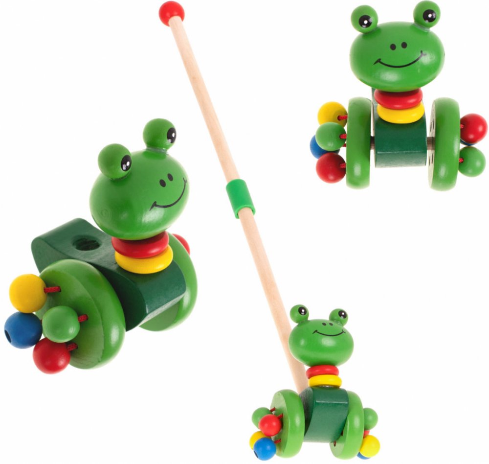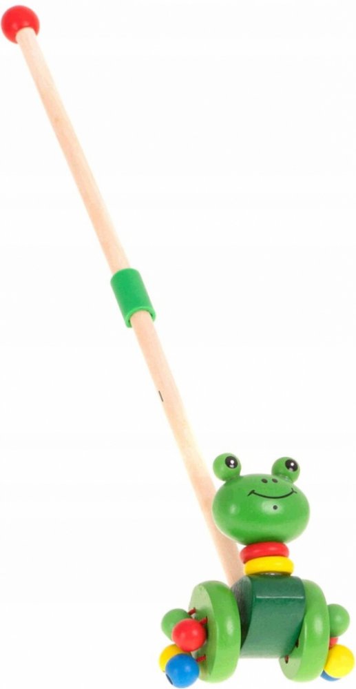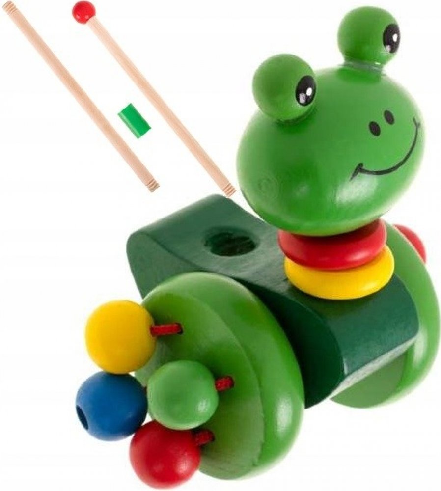 Přátelská žába ze dřeva, kterou lze vést pomocí vodítka. Fantastická hračka pro děti, které začínají chodit. Bude to skvělá motivace ke zlepšení chůze. Barevná žába bude dokonalým společníkem na procházkách. Dřevěný běhoun lze snadno namontovat a demontovat. S hračkou si lze hrát i bez běhounu. Žabka je vybavena 2 velkými koly. Ke každému z kol jsou připevněny 4 barevné korálky, které během jízdy chrastí. Vyrobeno s důrazem na každý detail. Hrany hračky byly pečlivě obroušeny, aby se dítěti při hře nevytvořily třísky.
