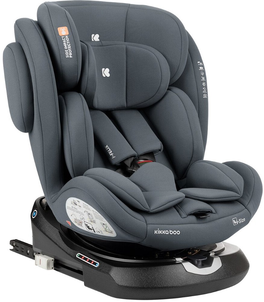 Dětská autosedačka KIKKABOO i-Felix i-Size pro děti od 40 do 150 cm je ideálním řešením pro rodiče hledající bezpečí, pohodlí a flexibilitu během růstu jejich dítěte od narození až do 12 let. KIKKABOO i-Felix nabízí otočení sedačky o 360° pro snadnou manipulaci s dítětem a možnost použití proti směru jízdy od 40 do 105 cm pro maximální bezpečnost nejmenších dětí. Po dosažení 76 cm lze sedačku bezpečně používat i ve směru jízdy. Pro komfort dítěte je k dispozici polohování – 5 poloh ve směru jízdy a 3 polohy proti směru jízdy, ideální pro sezení i spaní během cesty. Sedačka je vybavena bezpečnostním systémem Isofix pro rychlou a pevnou instalaci, doplněným o Top Tether úchyt pro dodatečnou stabilitu. Zabezpečení zvyšuje systém boční ochrany SPS, chránící dítě při bočním nárazu. Pro maximální pohodlí a bezpečnost je k dispozici nastavitelná opěrka hlavy se 11 polohami podle výšky dítěte a 5-bodový bezpečnostní pás s měkkým polstrováním, který lze snadno nastavit jednou rukou.