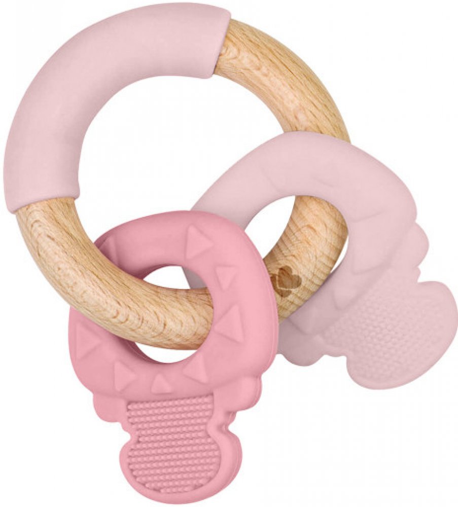 Kousátko KikkaBoo v podobě kroužku s klíči je vyrobené z bezpečného, jemného silikonu a bukového dřeva.
