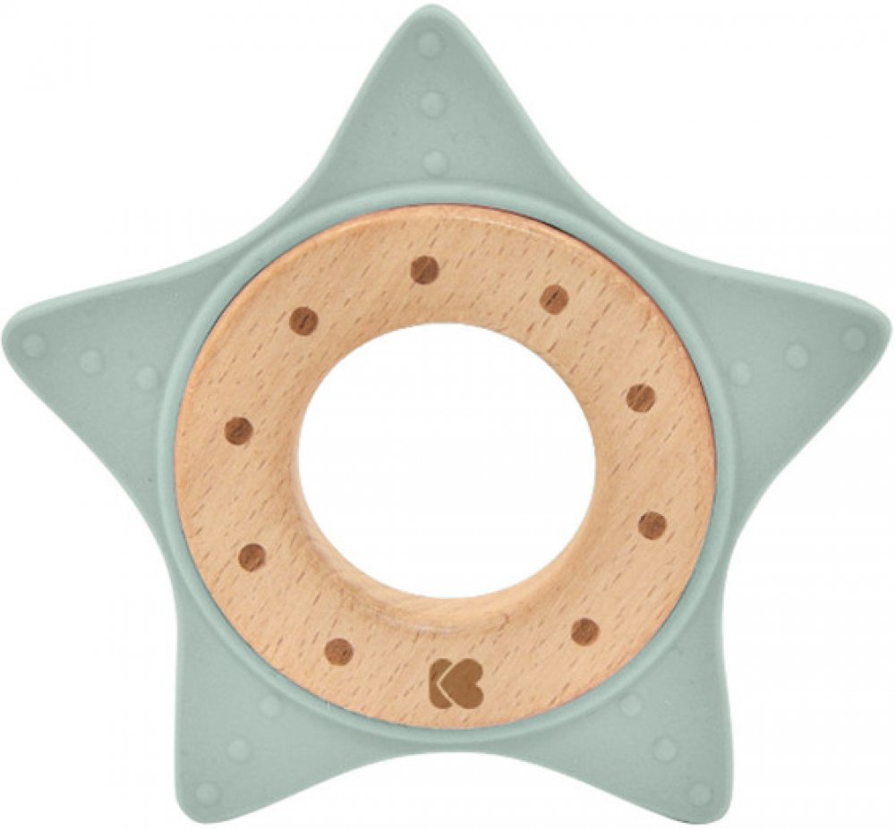 Kousátko KikkaBoo ve tvaru hvězdy je vyrobené z bezpečného, jemného silikonu a bukového dřeva.