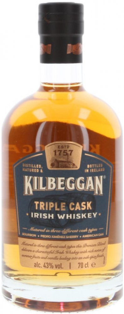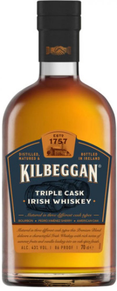 Kilbeggan Triple Cask je irská blended whiskey, která zraje v kombinaci tří typů sudů: po bourbonu, po sherry a v čerstvých sudech z amerického dubu. Díky tomuto trojímu zrání získává komplexní chuť s tóny vanilky, karamelu, sušeného ovoce a jemného koření. Whiskey pochází z Kilbeggan Distillery, nejstarší nepřetržitě fungující palírny v Irsku, a typicky zraje 4–6 let, aby dosáhla vyvážené jemnost...