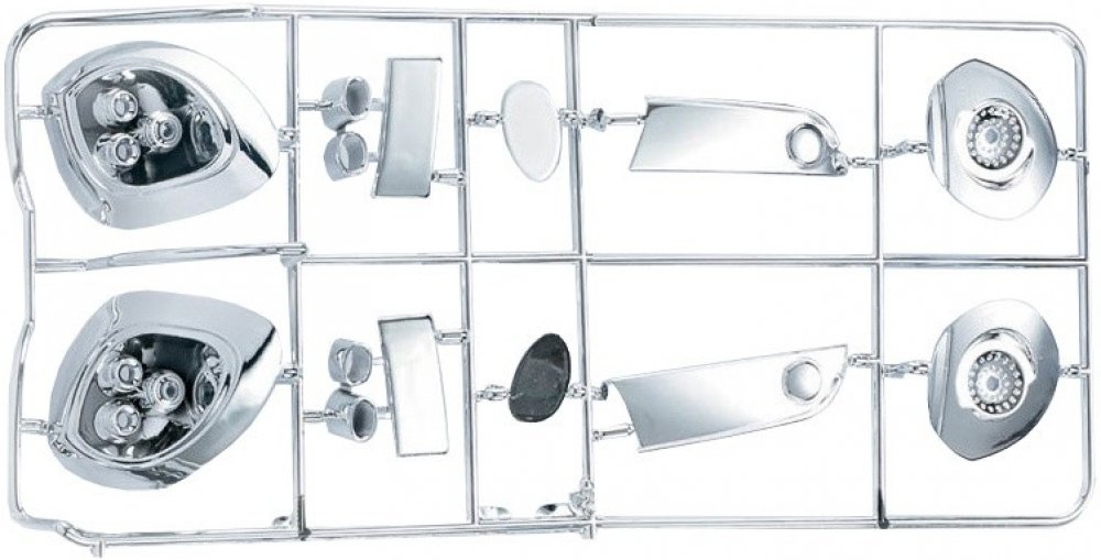 Obsahem balení je 2 x plastová chromová vložka předních světel, 2 x plastová chromová vložka zadních světel, výfuková trubka, 2 x plastové chromované sklo.