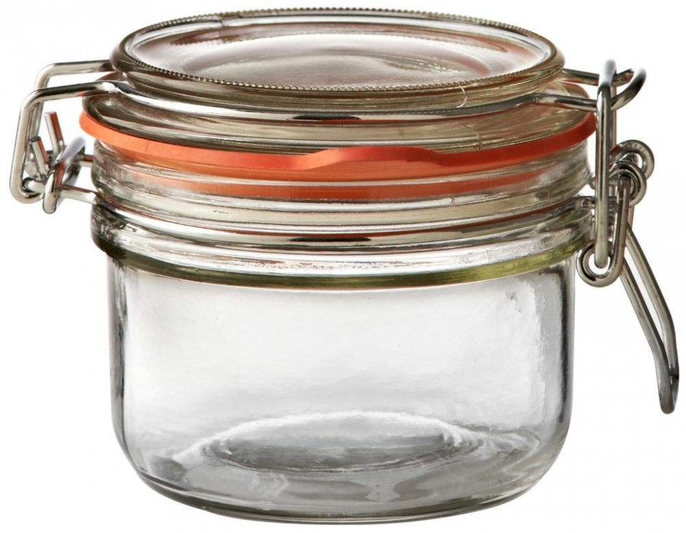 Kulatá zavařovací sklenice Kilner se skleněným víčkem a klipem z nerezové oceli.