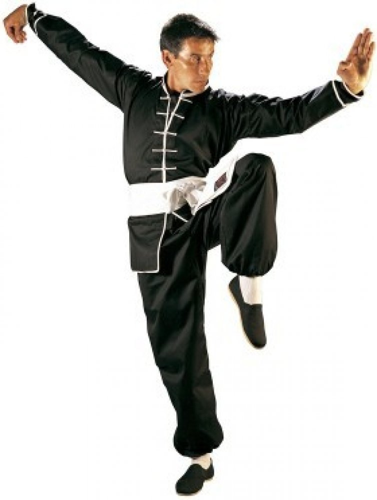 Tradiční černá uniforma na Tai Chi a Kung Fu s bílým lemem; vyrobeno ze 100% bavlněné plátěné látky.Kimono je velmi lehké a pohodlné, jeho vzor zachovává podstatu tradiční uniformy