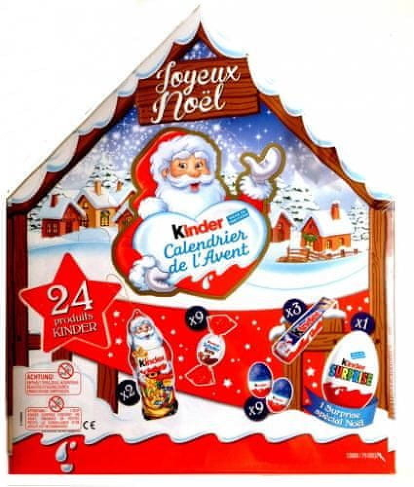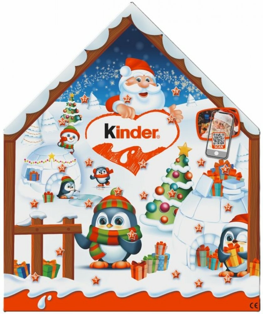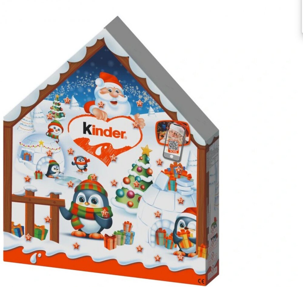 Kinder adventní kalendář Domek Adventní kalendář ve tvaru domečku. Obsahuje 2× Kinder figurku Mikuláše, 9× Schoko-bons, 9× mini vajíčko s mléčnou náplní, 3× kinder čokoláda a 1× Kinder vajíčko s překvapením