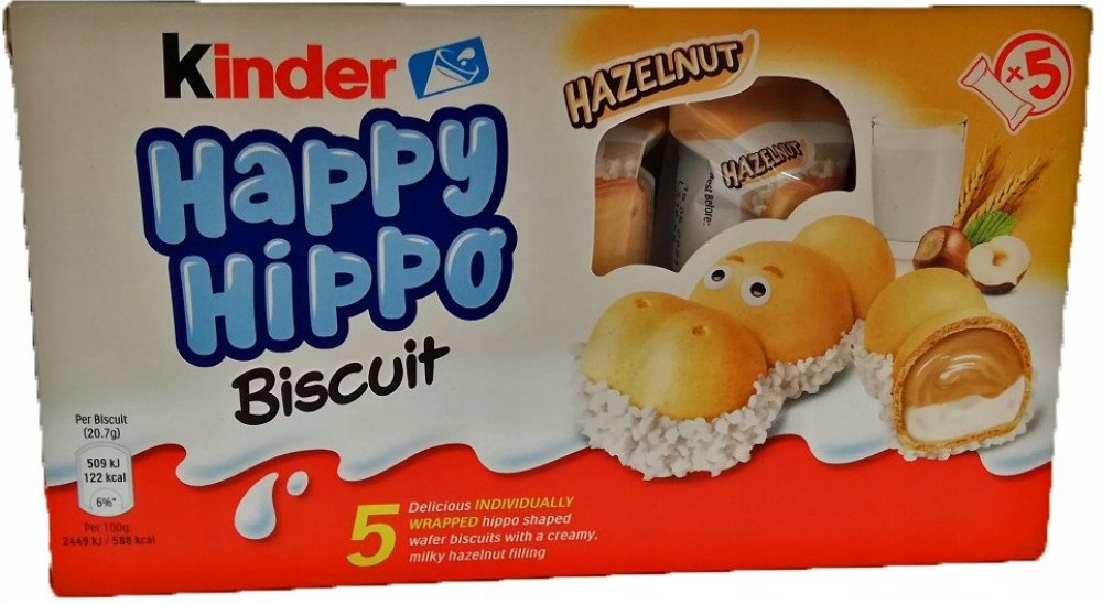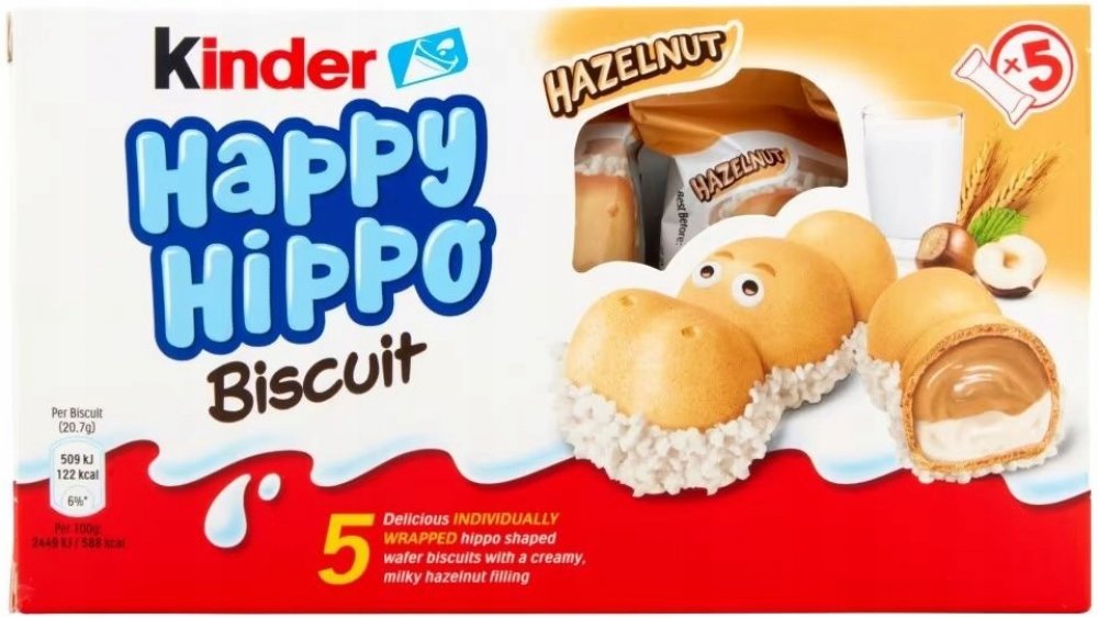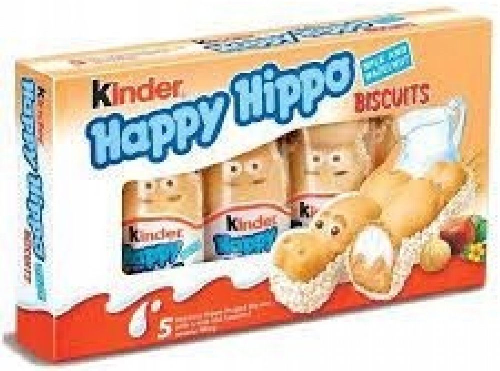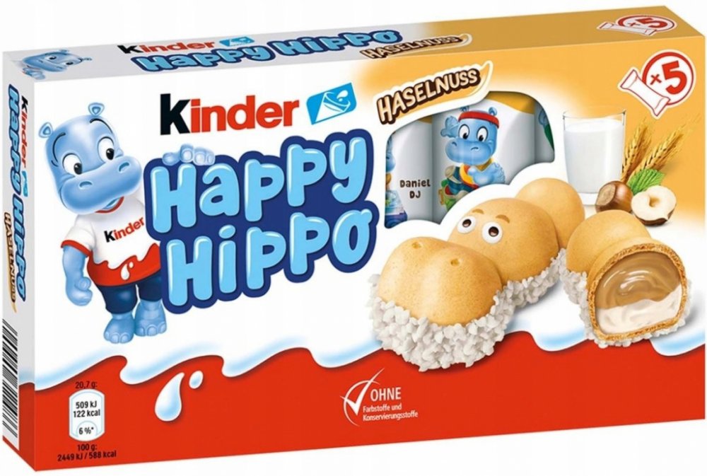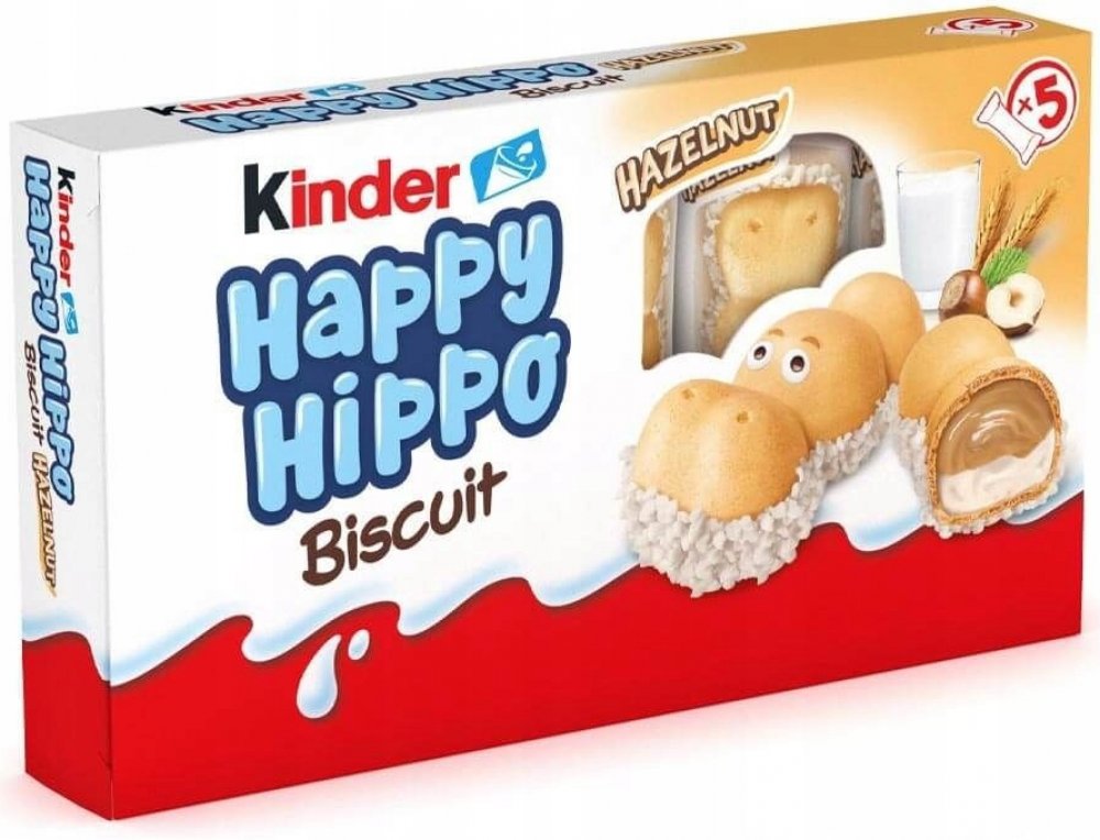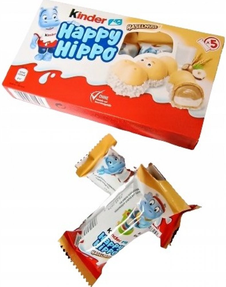 Kinder Happy Hippo je křupavá Oplatek ve tvaru hrošíka s dvojitou krémovou náplní. Porce vhodná pro děti, jednotlivě balená.