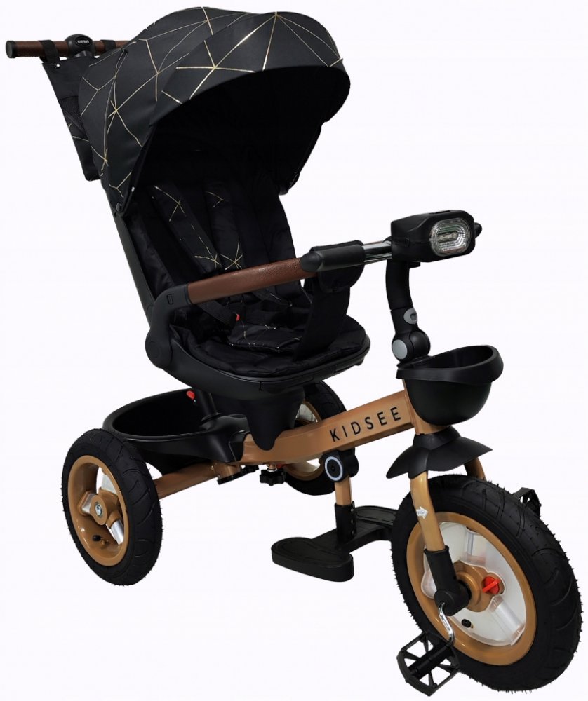 - pohodlí v každé situaci - sedadlo kola je nejen otočné, ale má také vysokou opěrku s možností sklopení do polohy pololehu, která se mimořádné hodí, kdy dítě zaspí. Barierka s potahem z umělé kůže je příjemná na dotek a opěrka nohou je skvělá, když si dítě chce odpočinout od pokusů o šlapání.