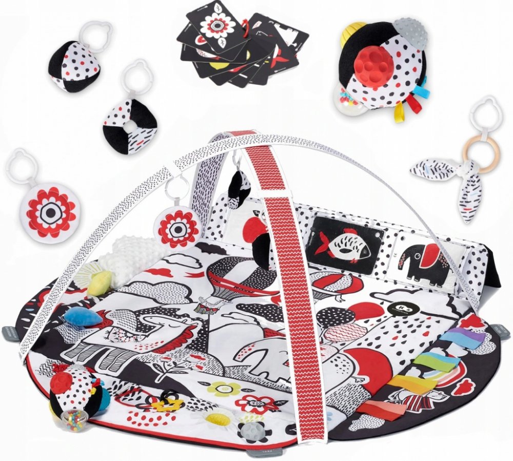 V sadě se nacházejí 2 hrazdy, na které lze zavěsit a libovolně posouvat přiložené hračky: 12 poznávacích karet 4SMART, závěsné zrcátko, závěsný míček s chrastítkem, závěsná šustící hračka, senzorický míček, plyšová hračka, barevné pásky a chrastící kuličky a zrcátko, které lze umístit pod fólii. Karty jsou na přívěsku – můžete je připnout např. ke kočárku nebo batohu. Navíc se v sadě nachází senzorický míček. Je velký, má různé barvy, tlačítka a vzory, proto upoutává pozornost dítěte a poskytuje mu mnoho zábavy. Zajímavé vzory a styly a multifunkčnost z ní dělají deku ideální pro každé dítě.