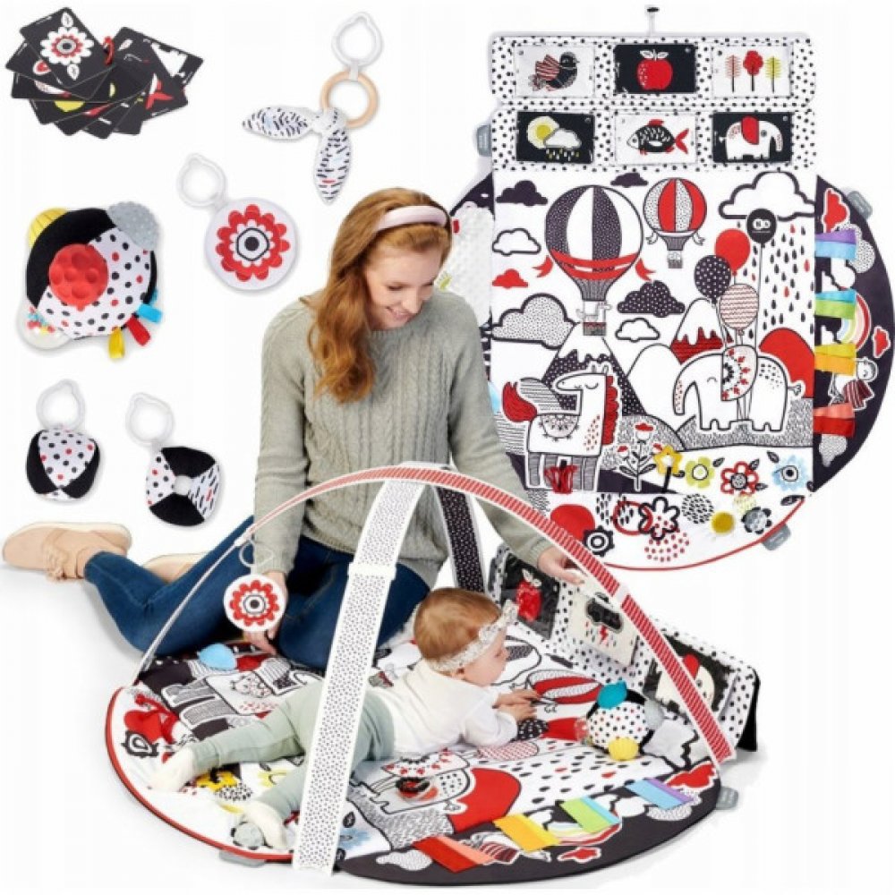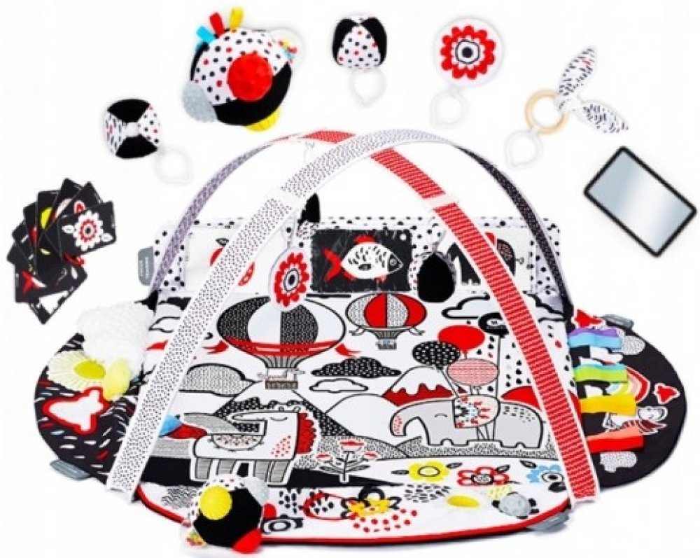 - v sadě je mnoho hraček, které rozvíjejí smysly: 12 kontrastních karet 4SMART, závěsné zrcátko, závěsný míček s chrastítkem, závěsná šustící hračka, senzorický míček, plyšová hračka, barevné pásky a chrastící kuličky a zrcátko, které lze umístit pod fólii.