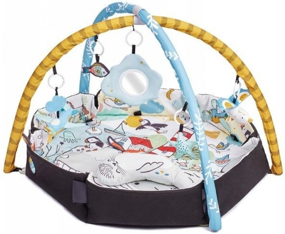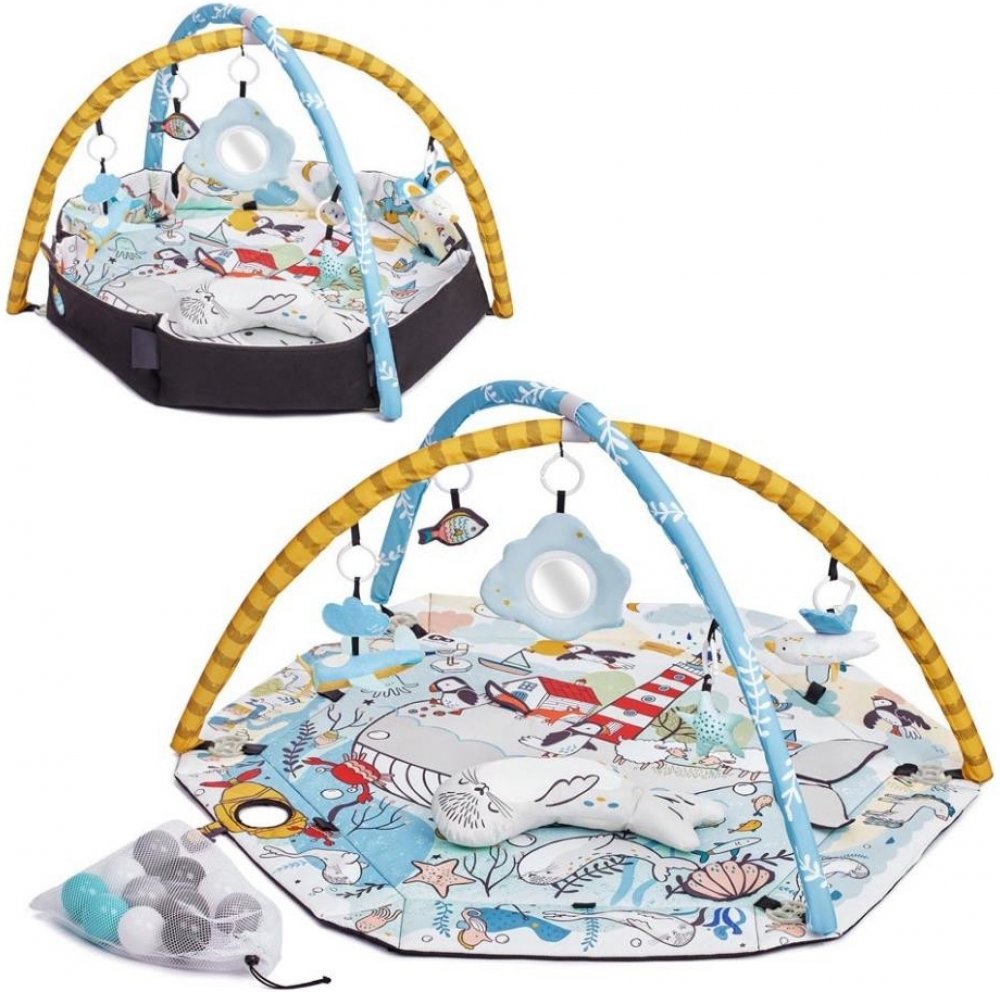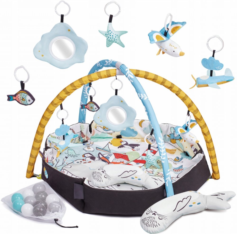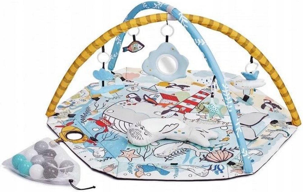 Vzdělávací podložka byla vyrobena z měkkého materiálu. Má 2 odnímatelné oblouky, na kterých visí veselé přívěsky. Na obloucích je celkem 7 hraček, které stimulují smysly dítěte a podněcují ke hře. Podložka má navíc 20 barevných kuličky, které umožňují vytvořit dětem veselý a bezpečný bazének.