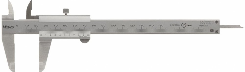 Analogové posuvné měřítko s nonitem MITUTOYO 0-150/0,02mm Pojistný šroub pro udržení polohy posuvné čelisti K dispozici jsou také třmeny s čelistmi z tvrdokovu Dodáváno s vinylovým pouzdrem v namontovaném kartonu. Kromě modelů 600 mm / 24 "jsou pouze kartony. 1000 mm / 40" dodávány v dřevěném pouzdře Obsah balení Analogové posuvné měřítko s nonitem MITUTOYO 0-150/0,02mm