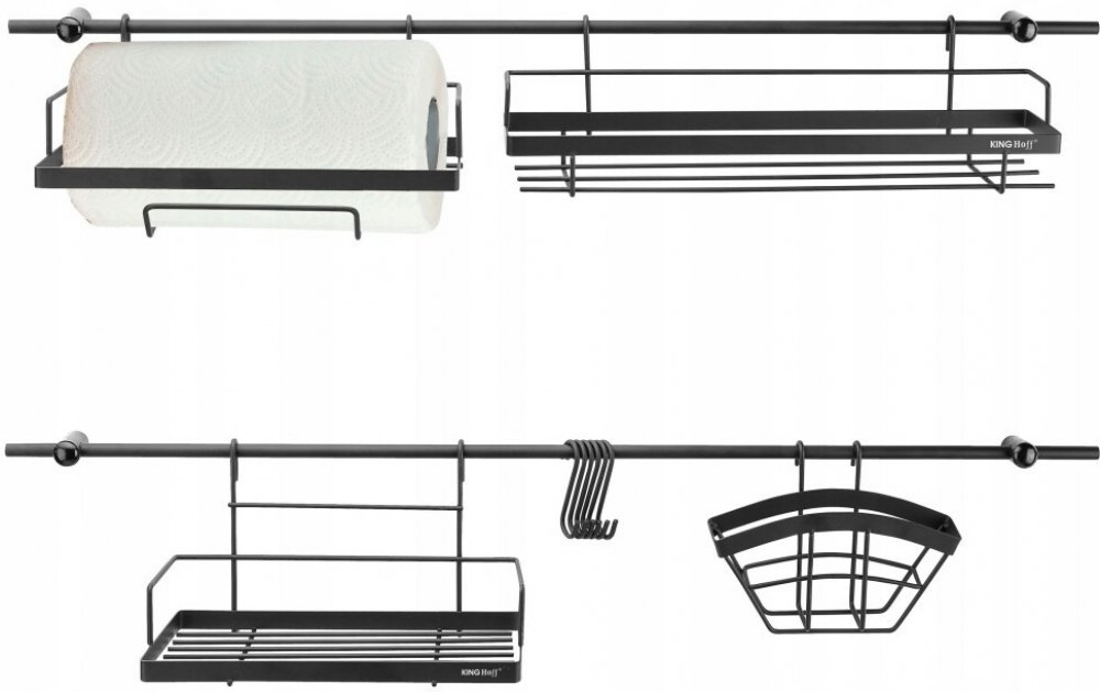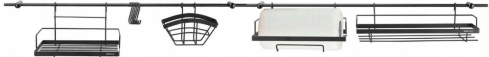 Sada obsahuje: věšák na kuchyňské ručníky s podnosem, 2 police na kuchyňské koření, 6 věšáků na kuchyňské nářadí, košík na ubrousky/filtry na kávu, 4 upevňovací držáky, 2 trubky z nerezové oceli. Vše je vyrobeno z lakované oceli v černé barvě. Možnost libovolné konfigurace.